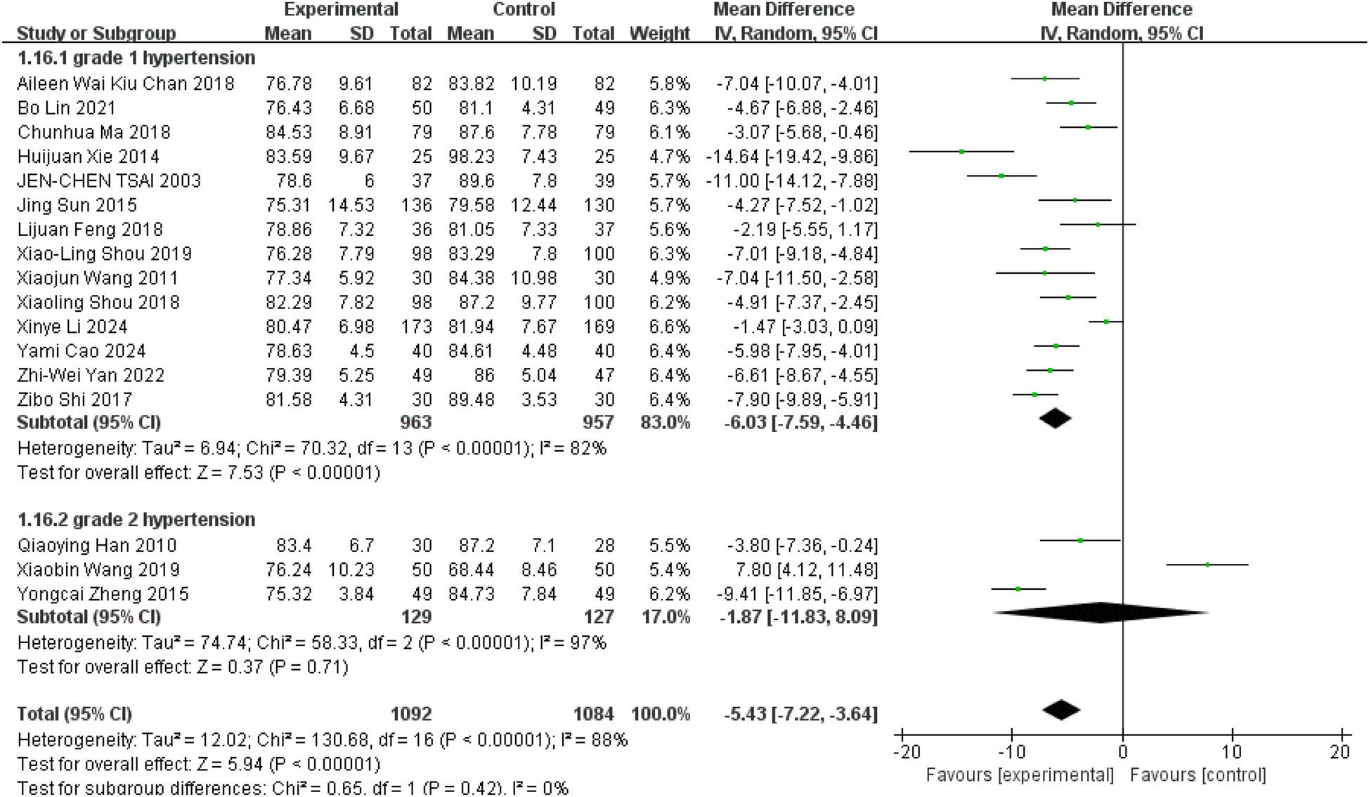 In studies examining the effects of Tai Chi on hypertension, these subtypes were used as grouping variables, classifying participants into Grade I and Grade II categories. Fourteen studies focused on Grade I hypertension showed that Tai Chi significantly reduced diastolic blood pressure (DBP) (Figure 7, WMD = −6.03; 95% CI = −7.59 to −4.46; Z = 7.53, P = 0.00001 < 0.05; I2 = 82%; Egger's test P = 0.092 > 0.05) (10, 11, 28, 30–32, 34–41). Similarly, three studies of class II hypertension showed that although Tai Chi was able to reduce diastolic blood pressure, the difference was not statistically significant (Figure 7, WMD = −1.87; 95% CI = −11.83 to 8.09; Z = 0.37, p = 0.71 > 0.05; I2 = 97%; Egger's test p = 0.35 > 0.05) (27, 29, 33).