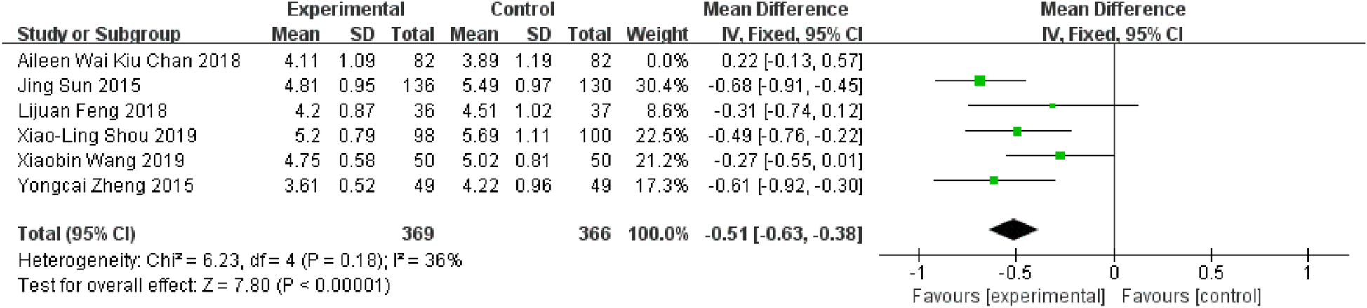 | Aileen Wai Kiu Chan 2018 (37) | 82(S) 32/50(M/W) | 82(S) 38/44(M/W) | 64.70 ± 7.59 | 65.13 ± 10.22 | Twenty-four Patterns of Taijiquan | General daily lifestyle interventions | 12 | 60 min, 2/w | ①②③④⑤⑥⑦⑧ |