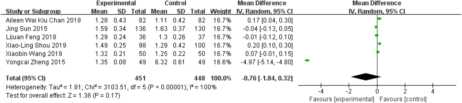 | Yongcai Zheng 2015 (29) | 49(S) 20/29(M/W) | 48(S) 19/29(M/W) | 54.71 ± 5.43 | 55.77 ± 6.24 | Twenty-four Patterns of Taijiquan | Nifedipine Sustained-release Tablets | 12 | 40–60 min, 4–8/w | ①②③④⑤⑥ |
