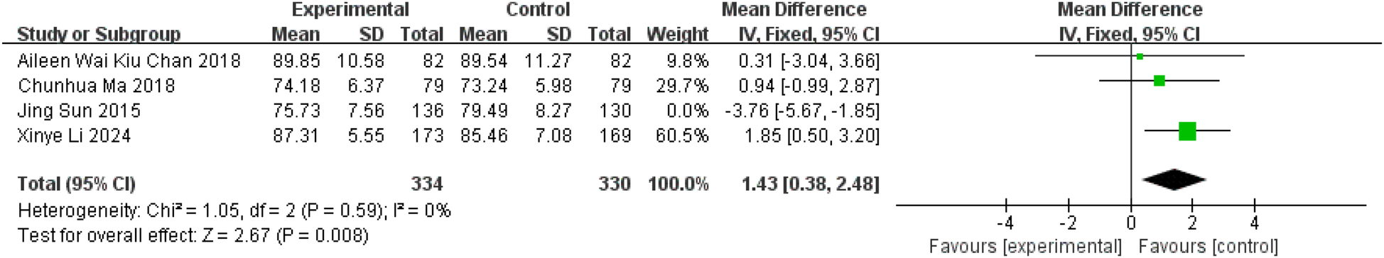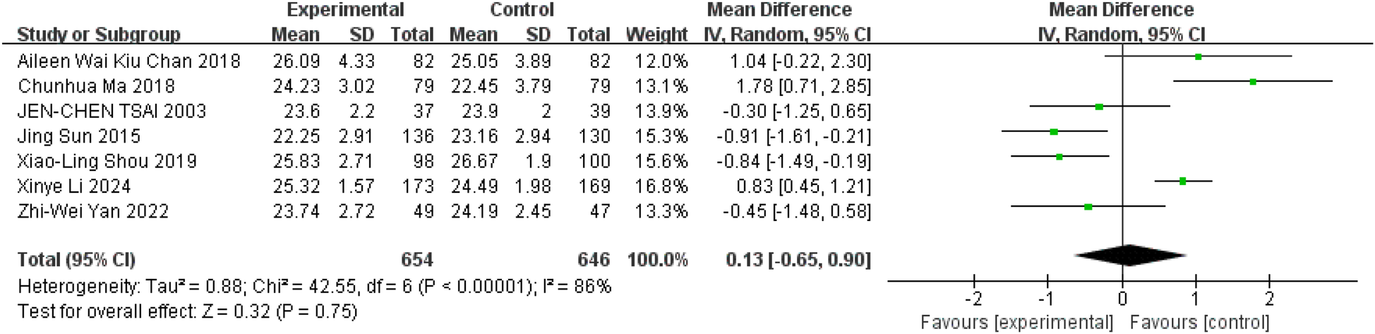 In recent years, more studies have shown that appropriate aerobic exercise can effectively regulate the physiological and psychological aspects of patients with EH. Tai Chi, as an aerobic exercise, combines strength and flexibility with a balance of movement and stillness (9). The coordination of breathing, consciousness, and physical movements during Tai Chi enhances patient concentration, reduces sympathetic nervous tension, improves nervous system function, regulates blood pressure, and promotes sleep (10–12). Tai Chi, through its unique mechanisms of mind-quieting, body-relaxation, regulated breathing, and dantian cultivation, offers comprehensive benefits to cardiovascular health. It improves blood pressure and lipid levels through various pathways, including anti-oxidative stress (13), anti-inflammation (14), modulation of the autonomic nervous system (15), and enhancement of endothelial function (16). Existing research indicates that Tai Chi is more economical and safer compared to drug treatment, and it is the most effective method among all non-drug interventions (17, 18). Previous meta-analyses of Tai Chi on patients with essential hypertension generally focused only on its impact on blood pressure values (SBP, DBP), and there were few reports on blood lipids and body morphology (19, 20), different stages of hypertension, and intervention cycles. Dyslipidemia is another significant factor contributing to essential hypertension (EH) (21). The impact of different intervention cycles on the effect is huge.
