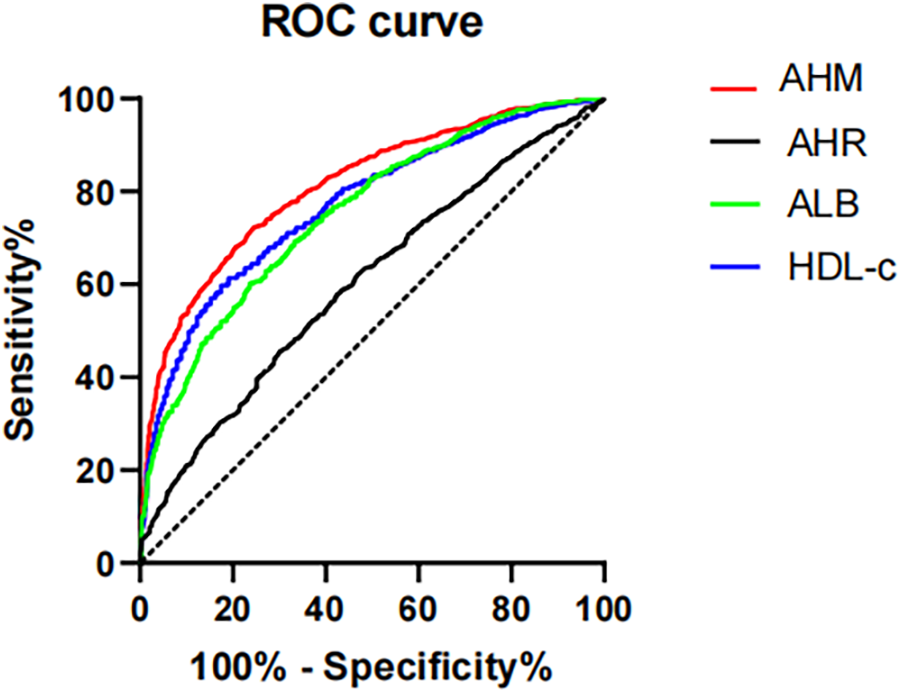AHR, albumin–high-density lipoprotein cholesterol ratio; AHM, albumin multiplied by high-density lipoprotein cholesterol; ALB, albumin; HDL-c, high-density lipoprotein cholesterol.