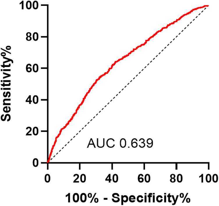 We used Spearman to analyze the correlation between influence factors and the GS score in CHD. As shown in Table 4, the GS score was negatively correlated with sex HDL-c, ALB, and AHM (Figure 3). It was positively correlated with LDL-c, TC, AST, HbA1c, GLU, Cr, smoking, and T2DM. It was not associated with TG, ALT, GGT, UA, age, drinkers, and hypertension. The CHD patients were categorized into two groups, single-vessel CHD (n = 645) and multivessel CHD (n = 1,179). As shown in Table 5, logistic regression models were constructed to show that the AHM was significantly related to CHD severity before and after multivariate adjustment (OR = 0.960, 95% CI: 0.952–0.968, P < 0.001). When the AHM was analyzed as a continuous variable, it was significantly associated with multivessel CHD (OR = 0.979, 95% CI: 0.968–0.991, P < 0.001). The ROC curve for multivessel CHD and AHM is shown in Figure 4. The cutoff value of AHM was 28.856, and the area under the ROC curve was 0.639 (95% CI: 0.612–0.665, P < 0.001) for predicting multivessel CHD. The results show that the higher the AHM is, the more severe the coronary lesions become.