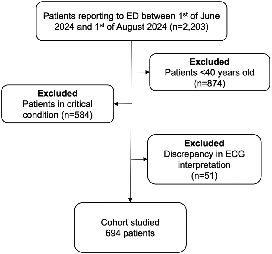 We included consecutive patients >40 years old who reported to the ED of a Syrian tertiary centre between July 2024 and September 2024. Patients had routine 12-lead electrocardiograms (ECGs) regardless of presenting complaints. Two cardiology consultants blindly verified ECG findings. We excluded critically unwell patients and ECG discrepancies between the two consultants. Data were taken from patients’ medical notes.