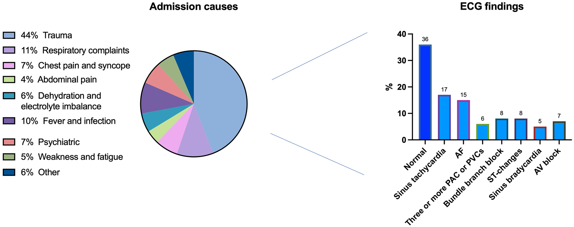 Admissions aetiology and electrocardiogram results. ECG, electrocardiogram; AF, atrial fibrillation; PAC, premature atrial contraction; PVC, premature ventricular contraction.