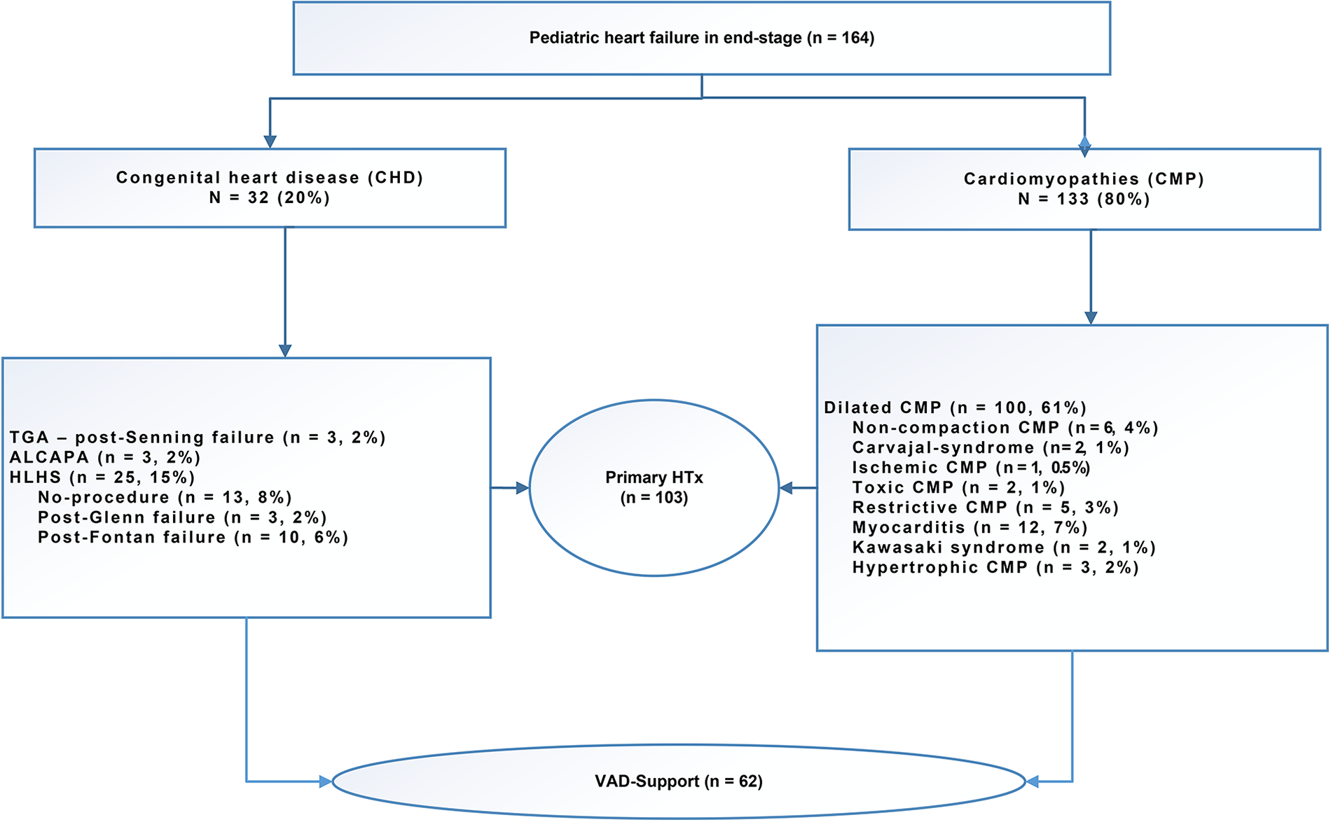 Pediatric heart transplantations at our center between October 1988 and July 2024 were retrospectively identified from various data sources. Exclusions criteria for the current analysis were patients aged >18 years and those who died on the waiting list for transplantation, patients with VAD support still awaiting transplantation or who had ventricular recovery and underwent VAD explantation. In addition, those cases of combined organ transplantation (heart and liver, heart and kidney, heart and lung) and re-transplantation. Patients with overt indication for double organ transplantation were refused VAD implantation.