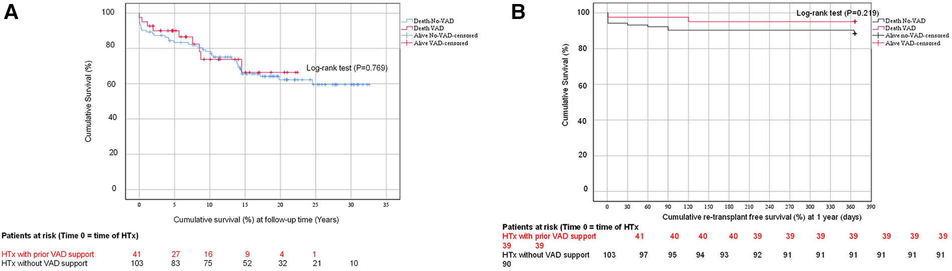 The provision of pre-HTx VAD support does not have an adverse effect on the short- and long-term survival of pediatric patients undergoing HTx and enables children with terminal heart failure survival until transplantation in an environment of significant donor/organ shortage. A higher mortality rate was only observed among children under three months of age with congenital heart disease (i.e HLHS and primary transplantation). Based on these results we would encourage other teams to use VAD more often and at an early stage of severe heart failure. More homogeneous and adequately powered cohorts are however needed to better understand the impact of VAD support on posttransplant outcomes.