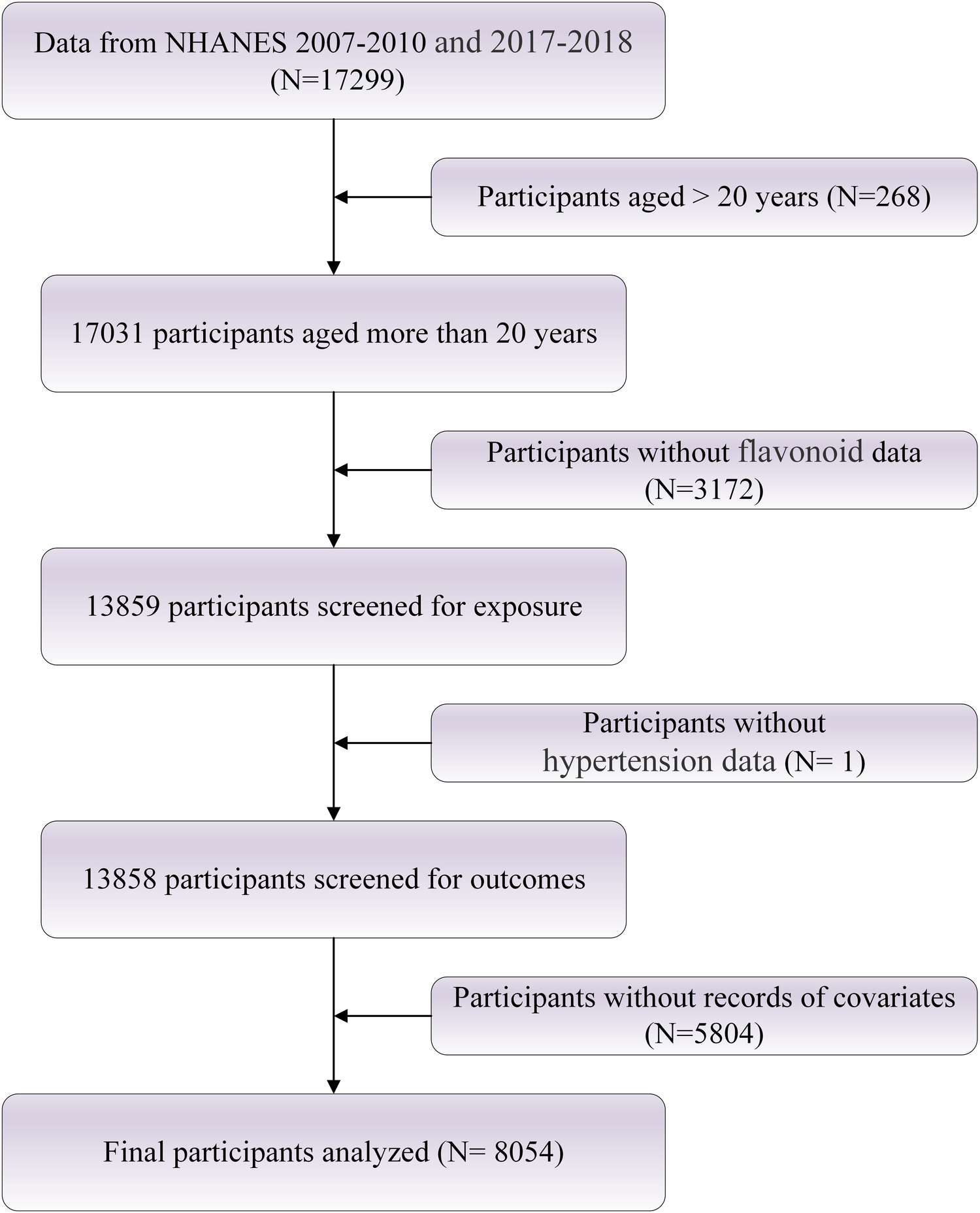 Given the inconsistency in existing research, this study aims to evaluate the association between flavonoid intake and hypertension using nationally representative data from the National Health and Nutrition Examination Survey (NHANES) 2007–2010 and 2017–2018, employing a cross-sectional study design. This research will contribute valuable evidence to inform dietary strategies for hypertension prevention and potentially provide new perspectives for clinical nutritional interventions.