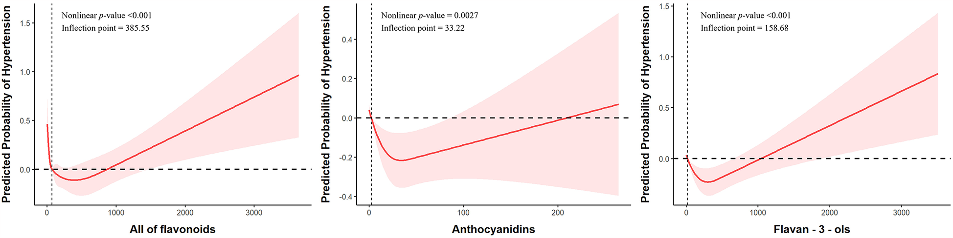 The relationship between flavonoids and hypertension remains inconsistent across studies. Several experimental investigations demonstrate the potential antihypertensive effects of flavonoids. Research demonstrates that flavonoids can lower blood pressure by enhancing nitric oxide (NO) bioavailability, reducing angiotensin-converting enzyme (ACE) activity, and improving vascular endothelial function (7–9). However, Zhu in their PRISMA-compliant meta-analysis of six randomized clinical trials involving 472 participants, failed to establish a significant association between anthocyanin supplementation and blood pressure reduction, finding no meaningful effect on either systolic blood pressure (10).