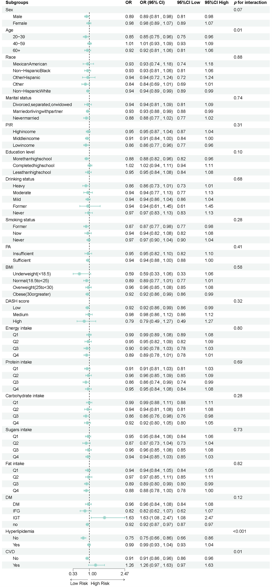 The baseline characteristics of the participants were stratified by hypertension status. Continuous variables were presented as means and standard errors, while categorical and ordinal variables were expressed as frequencies and percentages. All analyses accounted for the complex sampling design and national representativeness of the NHANES through the application of appropriate survey weights. Logistic regression models were used to examine the association between flavonoid intake and the prevalence of hypertension. Flavonoid intake was categorized into quartiles (Q1–Q4). Three models were constructed: the crude model was unadjusted; model 1 was adjusted for age, sex, and race; and model 2 was further adjusted for marital status, PIR, education level, drinking status, smoking status, PA, BIM, DASH score, energy intake, protein intake, carbohydrate intake, sugar intake, fat intake, and histories of diabetes, hyperlipidemia, and cardiovascular disease. The dose–response relationship between flavonoid intake and hypertension was explored using restricted cubic spline (RCS) regression based on multivariable logistic models, with nonlinearity assessed by p-values. Subgroup analyses were also performed to evaluate potential effect modifications. A two-sided P-value < 0.05 was considered indicative of statistical significance. All statistical analyses were conducted using R software (version 4.2.3).