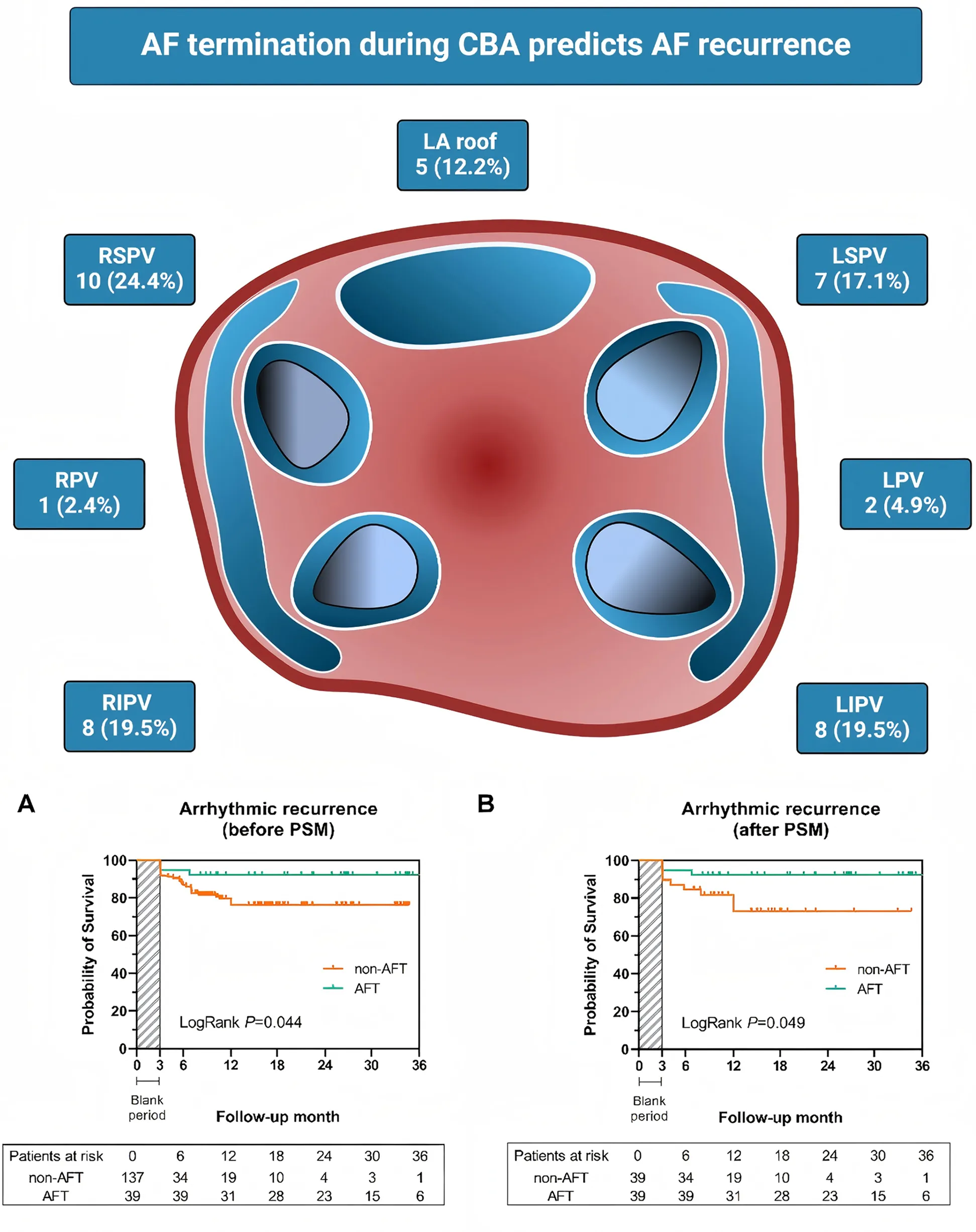 A total of 189 patients [65.0 (59.0–71.0) years] were included. Among them, 41 experienced instant AFT, while 148 remained in AF rhythm. The baseline conditions were similar, except that patients with AFT presented significantly lower left atrial diameter (LAD). During a follow-up of 16.0 [9.1–26.9] months, the recurrence rates of arrhythmias were significantly lower in the AFT group (log-rank P = 0.044). Both AFT [HR: 0.298, 95% CI: (0.091–0.976), P = 0.035] and baseline LAD [HR: 1.079, 95% CI: (1.012–1.151), P = 0.021] were independent predictors of recurrence. We further assessed the prognostic value of AFT in PSM groups which showed that the recurrence rates were also significantly lower in the AFT group (log-rank P = 0.049).