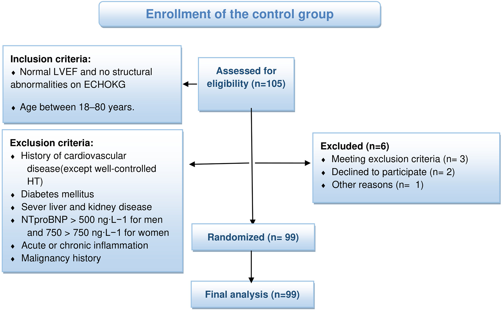 For the control group, we recruited healthy individuals, with normal LVEF and no structural cardiac abnormalities, and age between 18 and 80 years. Exclusion criteria were as follows: history of any cardiovascular disease (except well-controlled arterial hypertension), diabetes mellitus, severe liver and kidney disease (checked by initial laboratory testing), NTproBNP >500 ng·l−1 for men and 750 ng·l−1 for women, known malignancy, or signs o acute or chronic inflammation with CRP >20 mg·l−1. Among 105 recruited healthy individuals who met the inclusion criteria, 6 met exclusion criteria or decided to quit the study, and were removed from the control group and study (see Figure 2).
