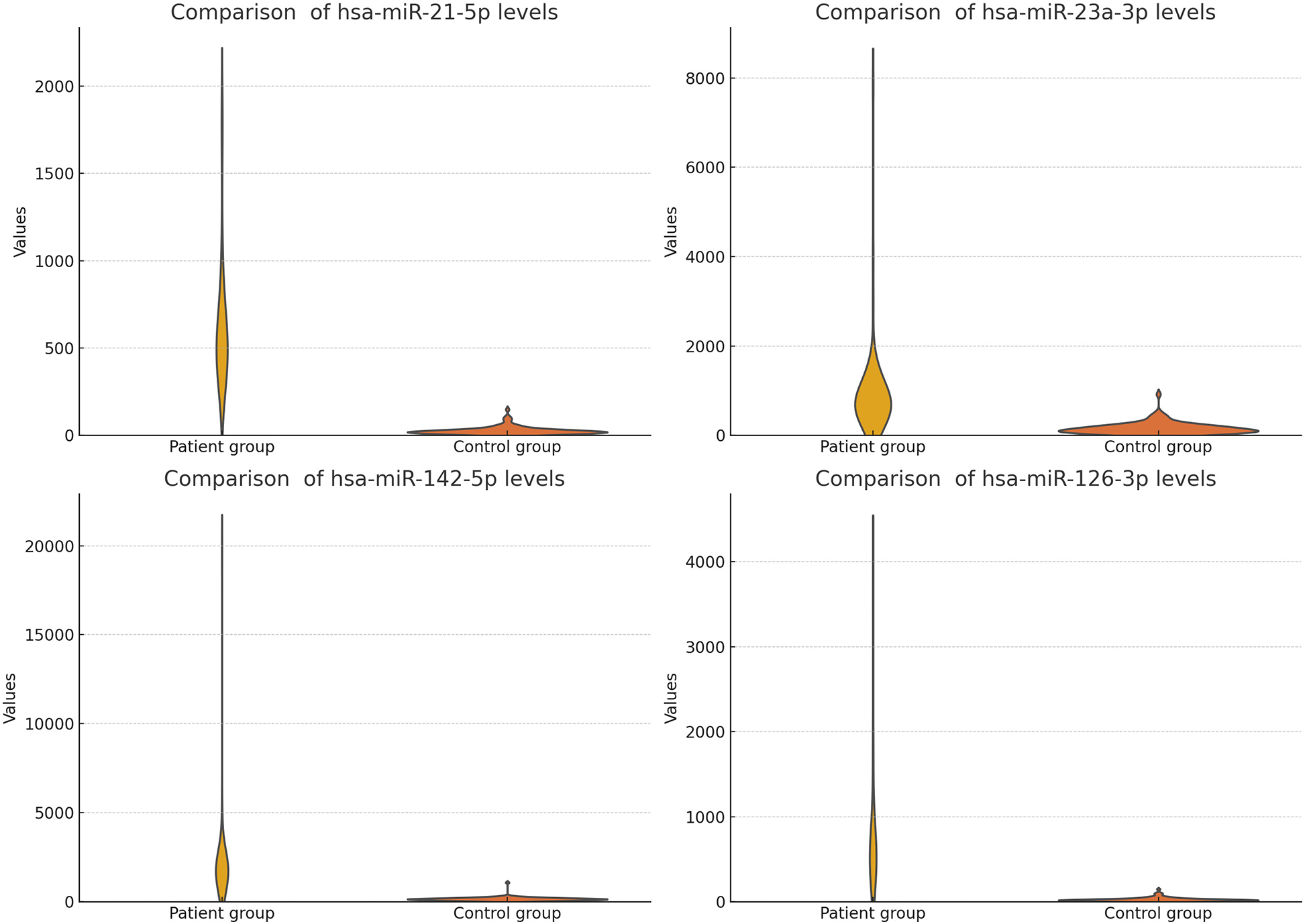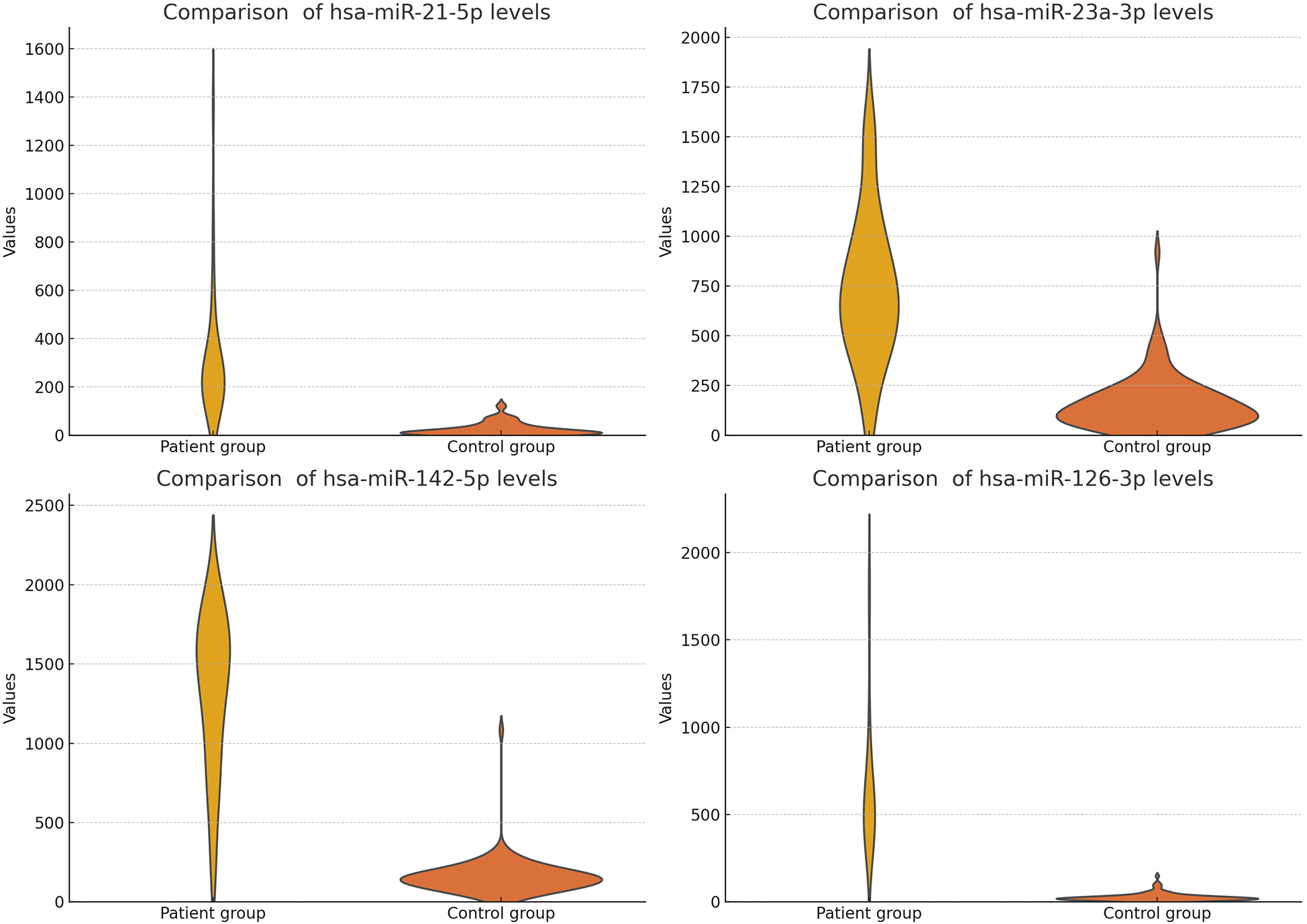 The study findings are summarized in Table 5 and Figures 3, 4 (We removed values over 2,000 from patient group for better visuality). All analyzed miRNAs (miR-21-5p, miR-23a-3p, miR-142-5p, and miR-126-3p) exhibited significantly higher levels in patients with chronic stable HF, compared to in the healthy control group (P < 0.001).