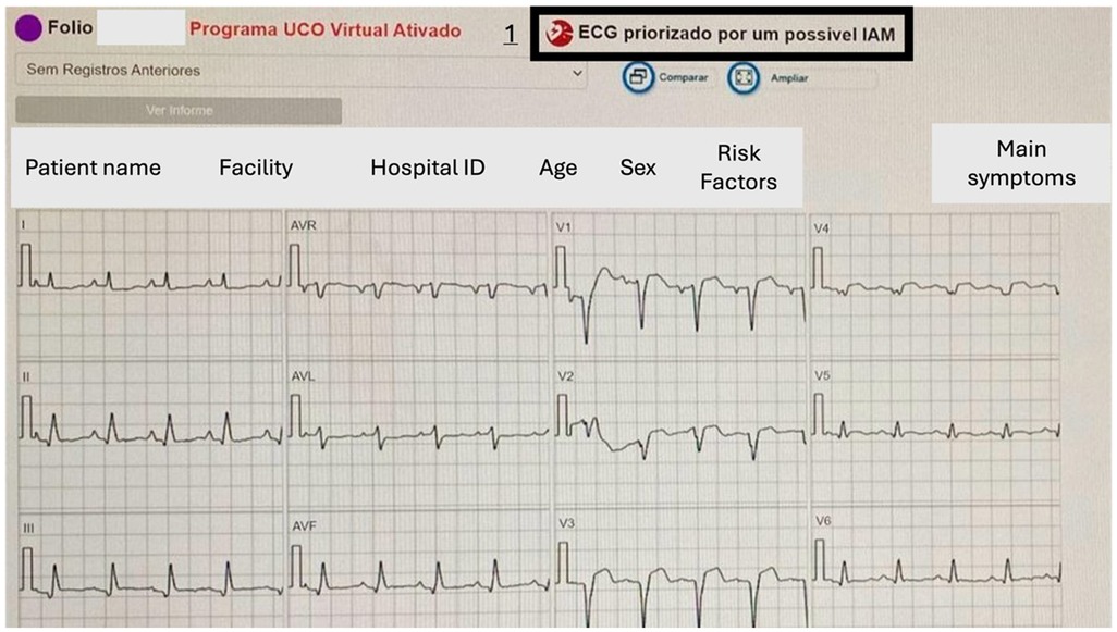 Although there is significant evidence supporting the cost-effectiveness of TM, its implementation continues to be difficult in developing countries (6). Artificial intelligence (AI) has many uses in cardiology, especially in electrocardiographic interpretation, supported by several promising studies with the potential to improve the use of TM strategies (7). Regarding STEMI, studies have shown that AI can diagnose the condition with accuracy comparable to that of a cardiologist (8). AI software with multi-labeling features to detect STEMI and other abnormalities can be used to help screen patients with suspected ischemic conditions (9). Recently, a randomized study demonstrated that AI-assisted ECG triage significantly reduced door-to-balloon time in STEMI patients at the emergency department (82.0 min vs. 96.0 min, p = 0.002) and ECG-to-balloon time in both emergency and inpatient settings compared with standard care (10).