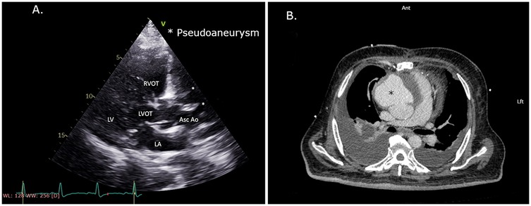 Panel A shows an ultrasound of the heart indicating a pseudoaneurysm. Structures labeled include RVOT, LVOT, LV, LA, and Asc Ao. Panel B is a CT scan displaying the heart in a cross-sectional view with an asterisk marking a specific area likely indicating the pseudoaneurysm.