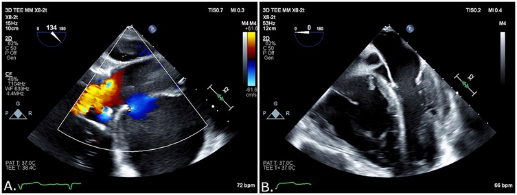Two transesophageal echocardiogram images. Image A shows blood flow dynamics with color Doppler indicating red and blue areas, suggesting different flow directions. Image B shows a greyscale cardiac structure without color Doppler. Both images include ultrasound settings and heart rate; Image A shows 72 bpm and Image B shows 66 bpm.