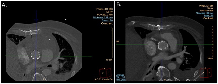 The patient was immediately transferred to the catheterization laboratory. Access to the left femoral artery with an 8-F introducer for stent delivery and to the right femoral vein with a 6-F introducer for a temporary pacemaker was achieved under ultrasound guidance. Left radial access was used to place a pigtail catheter in the sinotubular junction (STJ). The procedure was performed under transesophageal echocardiography (TEE) imaging, which revealed a pseudoaneurysm with a mixed echo-dense and liquid content (Figures 2A,B and Supplementary Video S1) compressing the left atrium, resulting in a restrictive filling pattern.