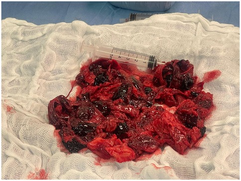 A second multidisciplinary heart team evaluation concluded that further intervention is needed to relieve the mediastinal pressure created by the remaining hematoma. As the patient was now stable to allow surgical intervention, a limited upper hemisternotomy (third intercostal space) was performed. The anterior mediastinum was cleared of blood clots (Figure 4) and the ascending aorta was exposed. The surgical team examined the stent graft confirming its position approximately 2 cm above the STJ. A small bleeding source was noticed from the lower end of the aortic opening. A bovine pericardial patch was mounted with bio-glue and manual pressure was placed on the patch for 5 min to ensure adequate patch alignment. Hemodynamic improvement was demonstrated, with rapid postoperative decline in central venous pressure from 23 to 13 mmHg. It should be noted that cultures from clots removed during the surgery and blood cultures taken during hospitalization were all negative.