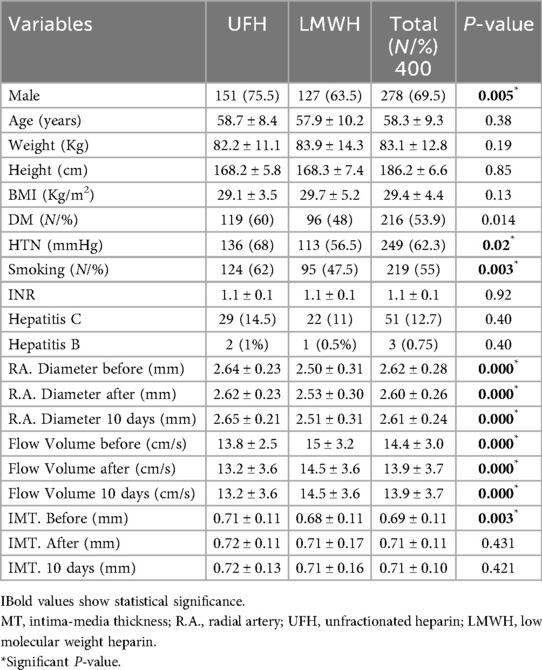 Methods: In this moderate sized clinical prospective study conducted from March 2019 to January 2020 at Al Azhar Assiut University Hospital and Sohag Cardiac and GIT Center, 400 patients undergoing elective coronary angiography via TRA were divided into two groups. Group A (n = 200) received UFH, and Group B (n = 200) received LMWH (enoxaparin). Parameters assessed included radial artery diameter, flow volume, intima-media thickness (IMT), and complications post-procedure.