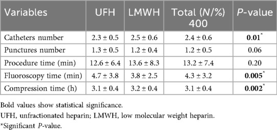 Significant differences were found in the used catheter number and fluoroscopy time but not in the number of punctures or procedure time. Specifically, the heparin group (Group A) used fewer catheters (2.3 ± 0.5) compared to the enoxaparin group (Group B), which used 2.5 ± 0.6, with this difference being statistically significant (P = 0.01). Both groups had similar mean numbers of punctures and procedure times, indicating no significant difference in these aspects. However, the fluoroscopy time was significantly shorter in the enoxaparin group (3.8 ± 2.5 min) compared to the heparin group (4.7 ± 3.8 min, P = 0.005), and a slight but statistically significant difference was observed in compression time, with enoxaparin requiring slightly more time (3.2 ± 0.4 h) compared to heparin (3.1 ± 0.4 h, P = 0.002) (Table 2).