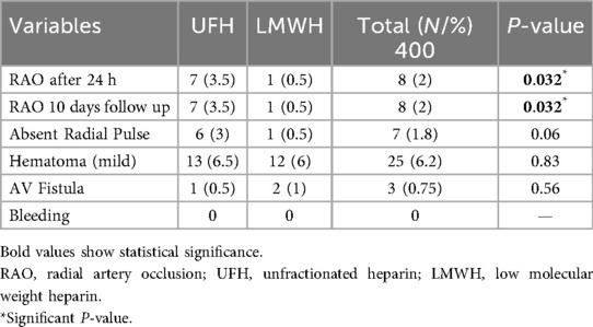 A significant difference was found in radial artery occlusion (RAO) rates, with 3.5% in the heparin group vs. 0.5% in the enoxaparin group (P-value 0.032). No statistically significant difference was observed between the groups in absent radial pulse rates or the occurrence of mild access site hematoma and arteriovenous (A.V.) fistulas. The study highlighted a specific case of RAO with preserved pulse in the heparin group and reported no cases of bleeding across all participants (Table 3).