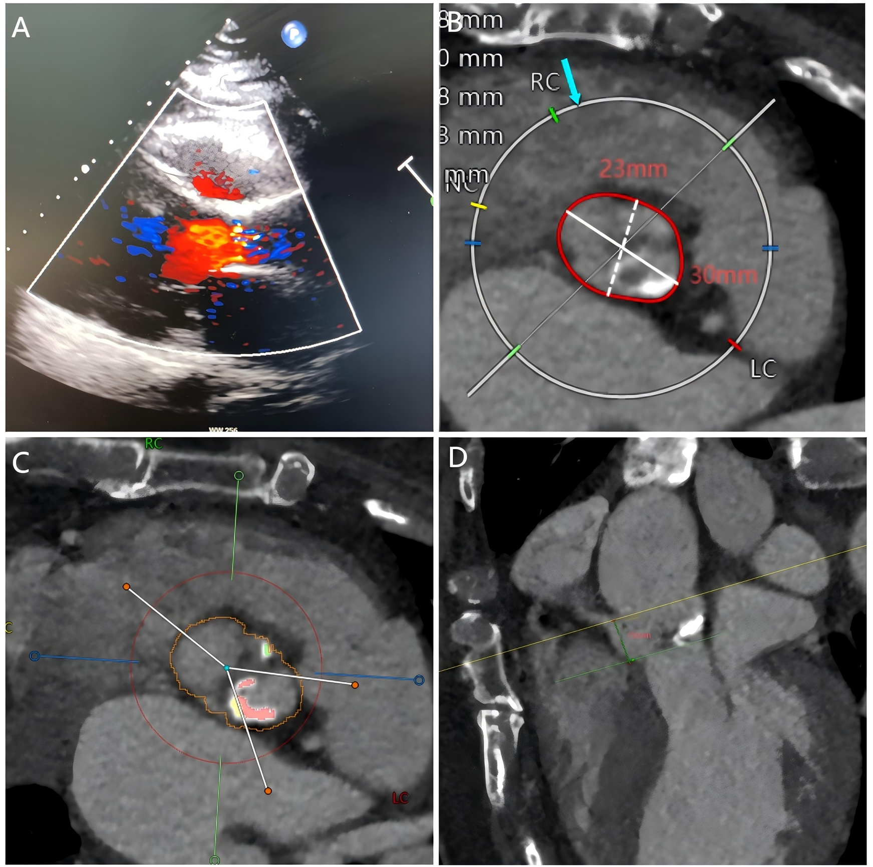 Echocardiography and cardiac computed tomography prior to TAVR. (A) Echocardiography showed severe aortic stenosis. (B–D) Pre-TAVR CT showed the aortic annulus diameter, calcified bicuspid aortic valve, and the position of the right coronary artery.
