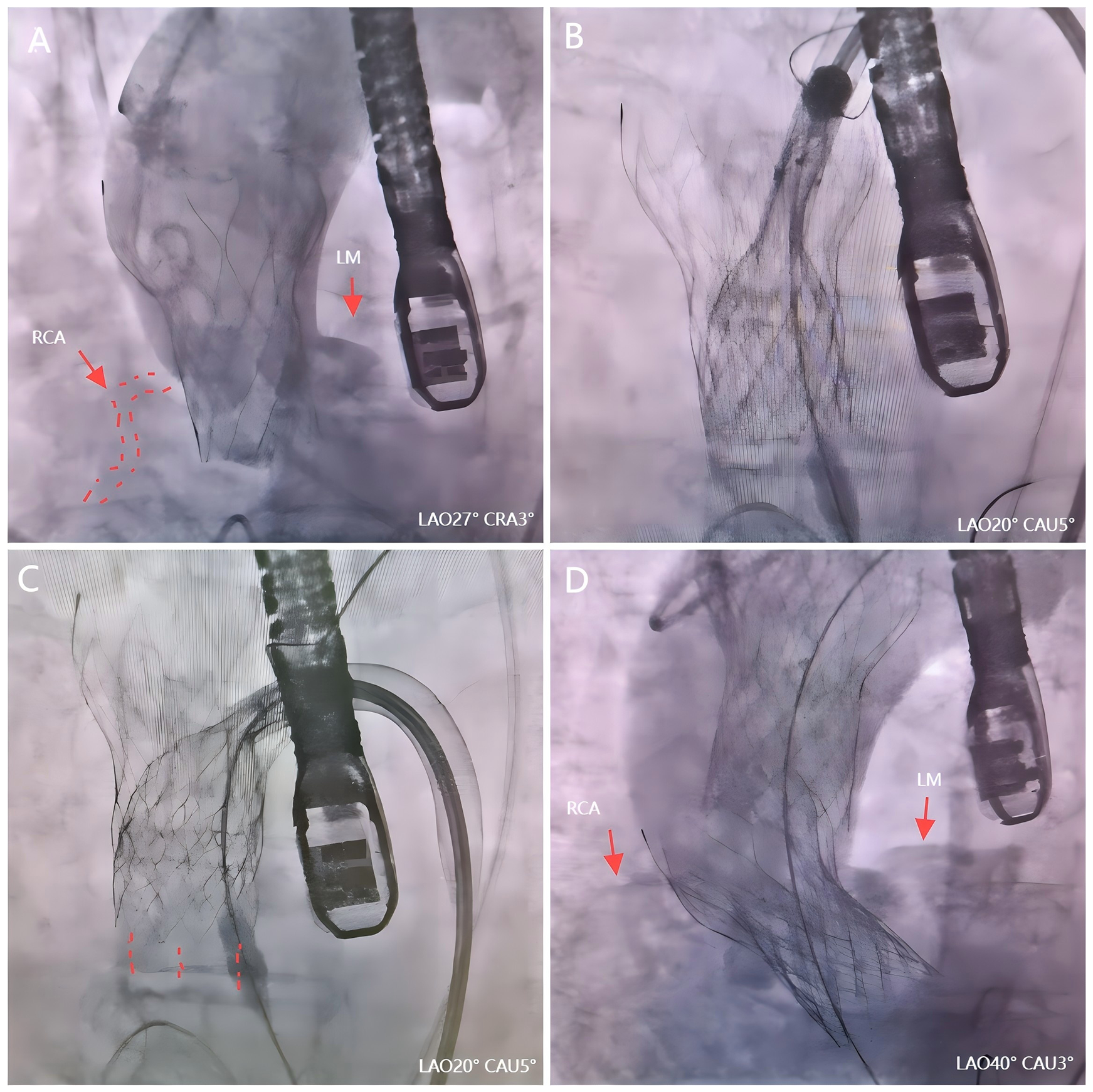 The second valve drag technique during TAVR. (A) Angiography revealed an acute obstruction of the right coronary artery. (B) The second valve successfully captured the first dislocated valve. (C) The first valve was repositioned by pulling the second valve toward the aorta arch. (D) Valve-valve intervention effectively addressed AS.