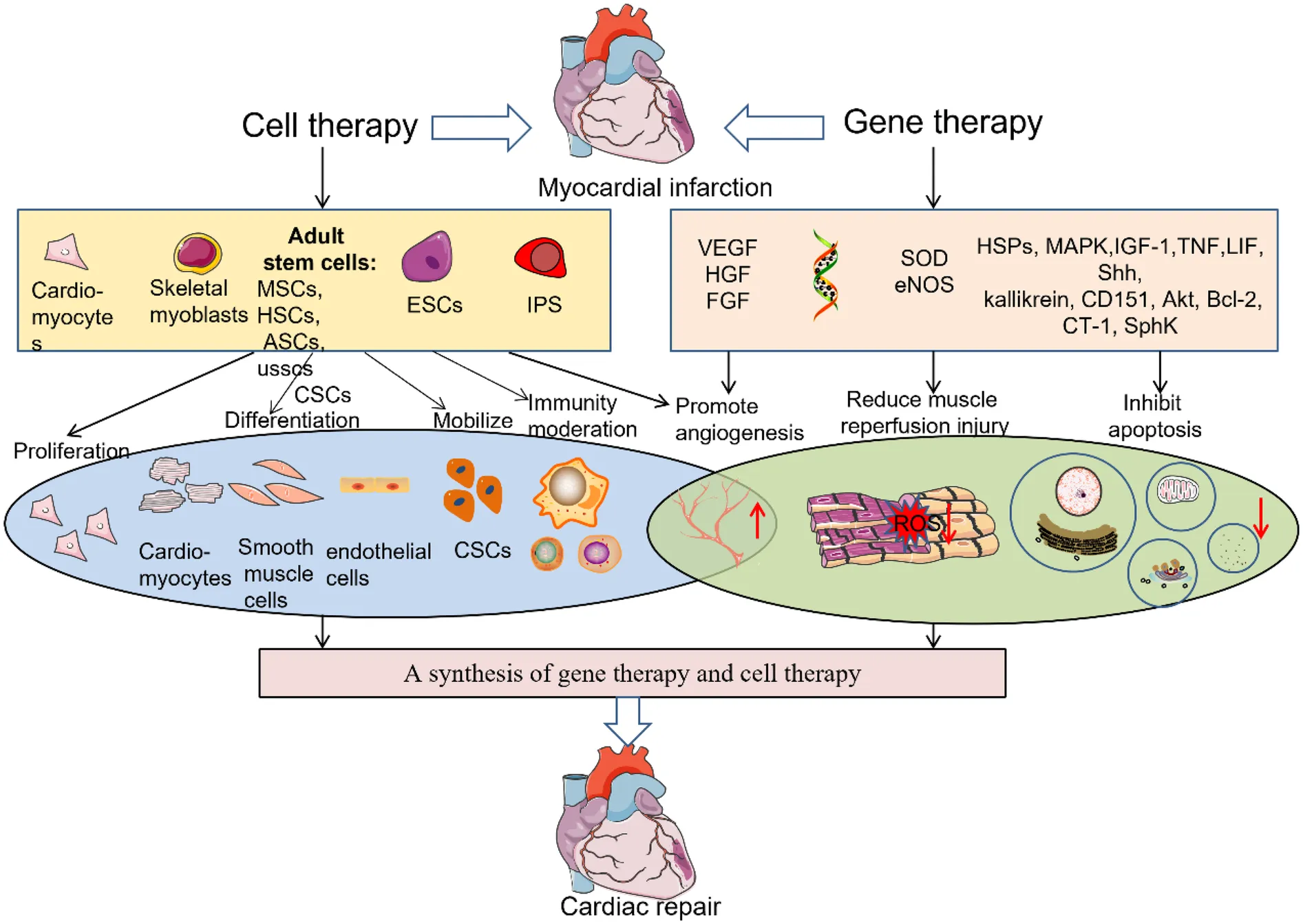 Myocardial infarction (MI), commonly known as a heart attack, remains a leading cause of morbidity and mortality worldwide. Despite advances in emergency medical interventions such as reperfusion therapy, many patients still suffer from significant long-term cardiac dysfunction due to irreversible myocardial damage. The limited regenerative capacity of the adult heart presents a major challenge in the treatment and recovery process (1). Therefore, exploring innovative therapeutic strategies to promote myocardial repair and improve cardiac function has become a critical area of research. In recent years, two promising approaches have emerged as potential game-changers in the treatment of myocardial infarction: stem cell therapy and gene therapy (2, 3). Stem cell therapy involves the use of various types of stem cells, such as mesenchymal stem cells (MSCs) and induced pluripotent stem cells (iPSCs), to replace damaged myocardial cells and stimulate the regeneration of cardiac tissue (4, 5). These cells can differentiate into cardiomyocytes, endothelial cells, and smooth muscle cells, thereby contributing to the structural and functional restoration of the heart. Additionally, stem cells can secrete paracrine factors that promote angiogenesis, reduce inflammation, and inhibit apoptosis, creating a more favorable environment for cardiac repair (6). On the other hand, gene therapy focuses on the delivery of specific genes to modify the expression of target proteins within cardiac cells. This approach aims to enhance the intrinsic regenerative capacity of the heart by upregulating genes involved in cardiomyocyte proliferation, survival, and differentiation. Overexpression of certain growth factors or transcription factors can stimulate the endogenous cardiac progenitor cells to proliferate and differentiate into functional cardiomyocytes (7, 8). Gene therapy can also target pathways involved in fibrosis and remodeling, thereby preventing adverse structural changes in the heart following an infarction (9, 10). However, several challenges remain to be addressed, including optimizing cell delivery methods, ensuring long-term gene expression, and minimizing potential side effects (11–14). This review aims to provide an in-depth analysis of the current progress, mechanisms of action, and future prospects of these two therapeutic approaches, highlighting their potential to transform the clinical management of myocardial infarction and improve patient outcomes.