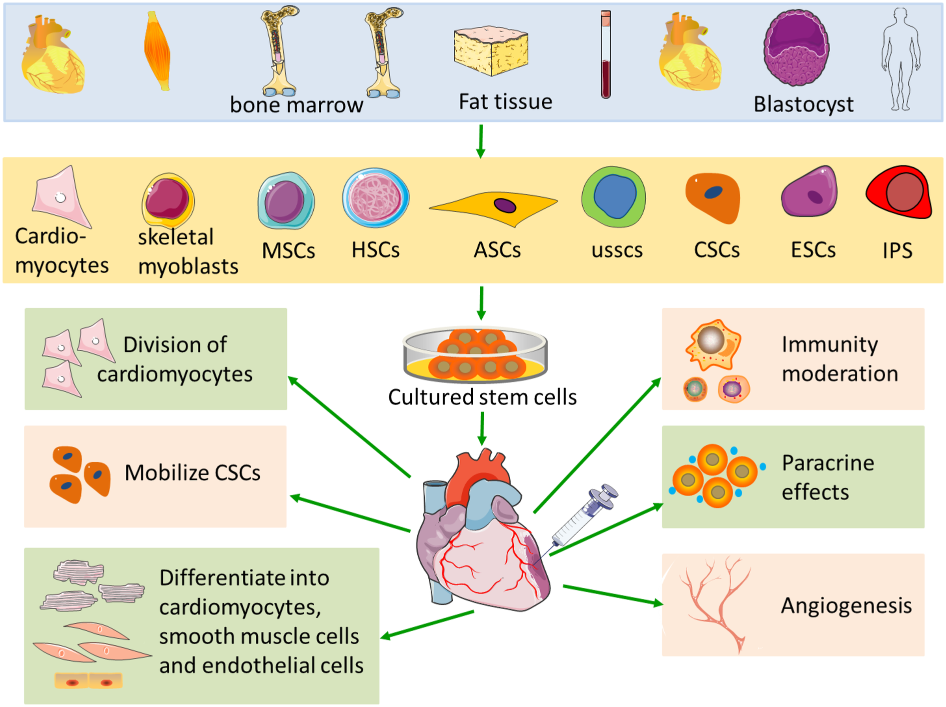Schematic of stem cell therapy in MI. MI necessitates the use of various cell types for myocardial regeneration. Each cell type has its own unique advantages and disadvantages when applied in the context of MI. MSCs, mesenchymal stem cells; HSCs, hematopoietic stem cells; ASCs, adults stem cells; USSCs, unrestricted somatic stem cell; CSCs, cardiac stem cells; ESCs, embryonic stem cells; iPS, inducible pluripotent stem cells.