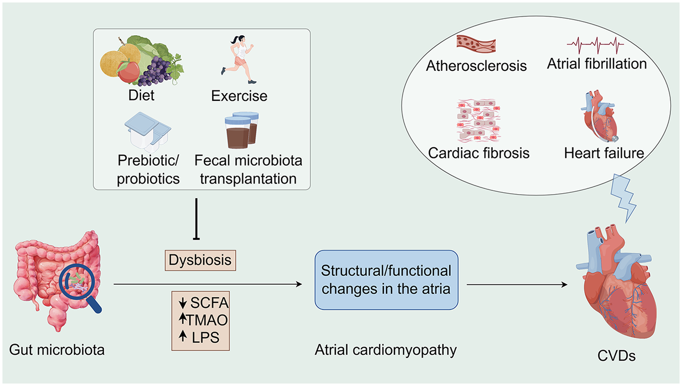 Associations between the gut microbiota, atrial cardiomyopathy, and cardiovascular diseases along potential interventions. Microbiome dysbiosis may lead to an increase in opportunistic pathogens or a decrease in SCFA-producing bacteria, which may lead to TMAO accumulation as well as a decrease in SCFA, all of which may contribute to the development of atrial cardiomyopathy and exacerbate the progression of CVDs. Conversely, interventions such as healthy diet, moderate exercise, prebiotic/probiotic use, and fecal microbiota transplantation offer opportunities to indirectly influence CVD progression. SCFA, short chain fatty acid; TMAO, trimethylamine-N-oxide; LPS, lipopolysaccharides; CVDs, cardiovascular diseases (By Figdraw).
