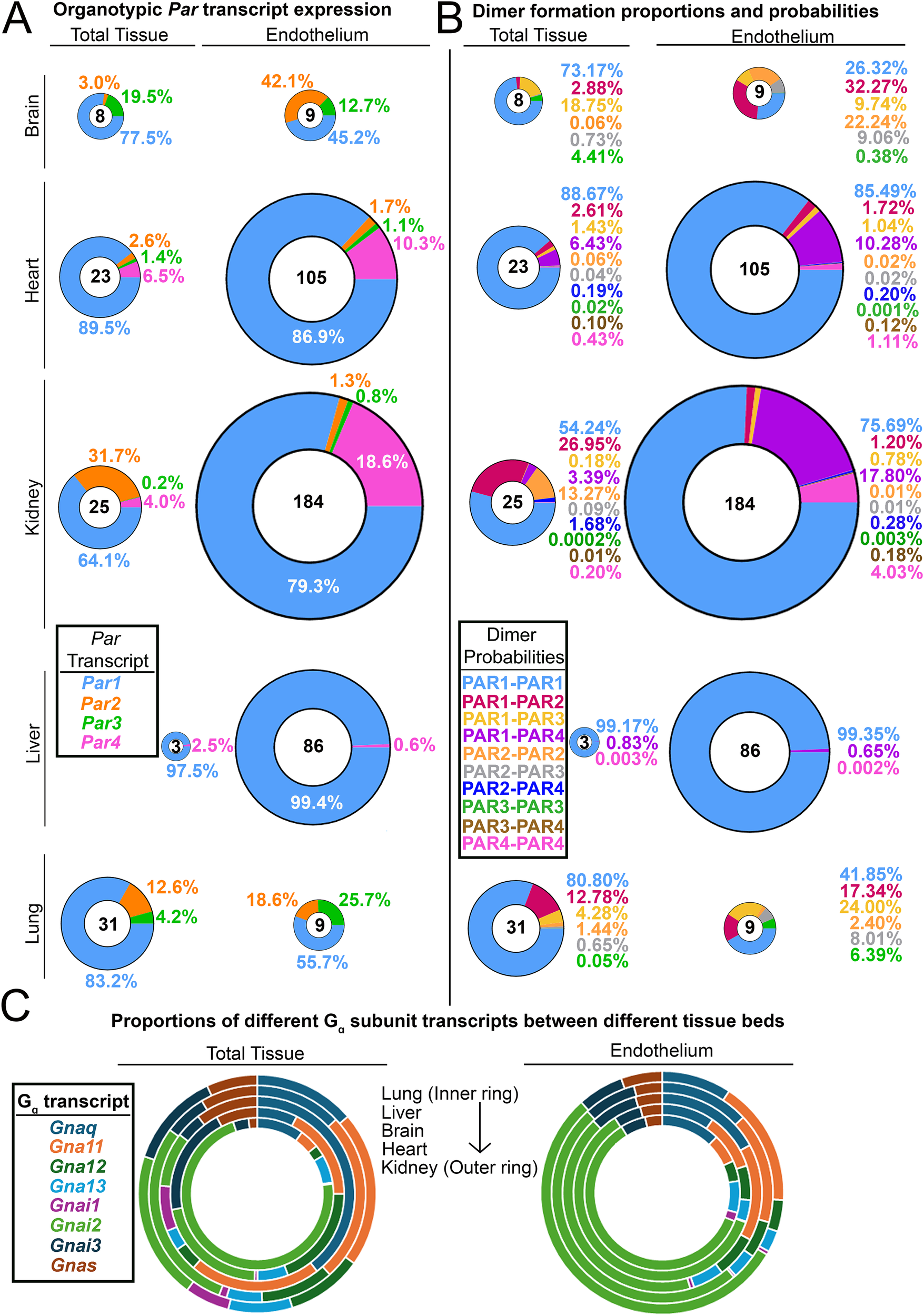 Organotypic differences in endothelial PARs and their G proteins. (A) Donut charts of transcript expression of all PARs in total tissues from different organs and the endothelium isolated from those organs. (B) Donut charts of PAR dimer formation probabilities in total tissues and endothelium from different organs. For A and B, the total transcript count for all PARs is shown in the center of each donut, and all donuts are sized to scale. (C) The proportion of G protein alpha subunit transcripts found in different organs and the endothelium isolated from those organs. Data for all organs in A–C (except for the liver) were generated by Cleuren et al. (59); liver data were generated by Rajala et al. (1).