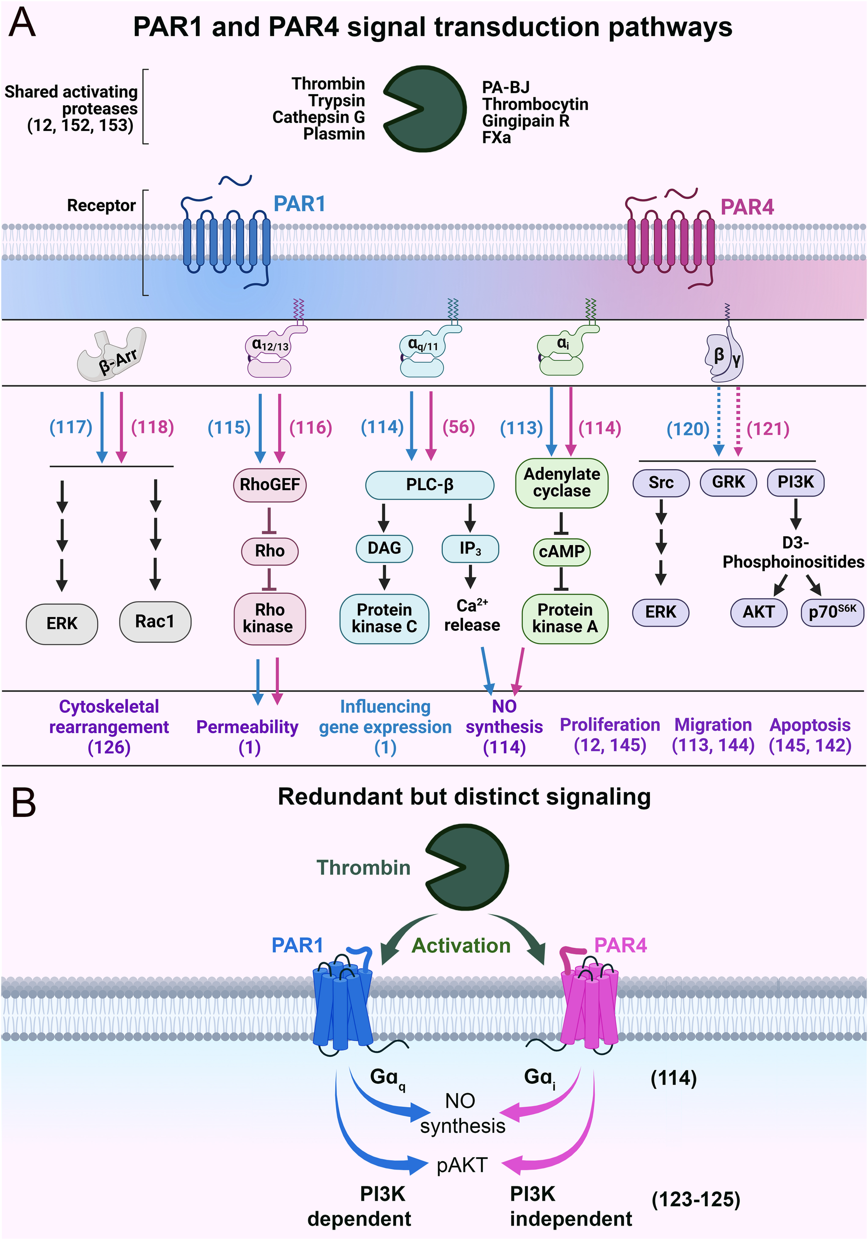 Schematics of PAR1 and PAR4 signal transduction pathways. (A) The major intracellular signaling events and biological effects following the activation of PAR1 and PAR4. Blue and pink arrows indicate PAR1- and PAR4-specific signaling, respectively. The purple text refers to the biological impacts mediated by PAR1 and PAR4. The blue text refers to biological effects mediated by PAR1 alone. Dashed lines indicate hypothesized behavior. (B) Schematic of functionally redundant but mechanistically distinct signaling of PAR1 and PAR4. Relevant citations are shown in parentheses.