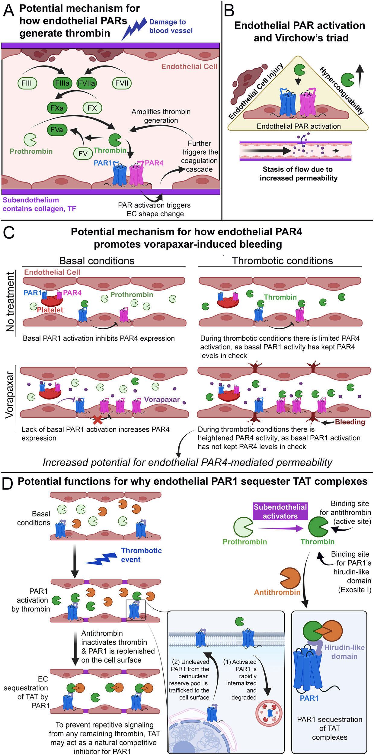 Endothelial PAR4 and thrombosis. (A) Schematic of how endothelial PARs potentially amplify thrombin generation after initial blood vessel damage. (B) Schematic of how endothelial PAR activation potentially increases thrombosis by promoting the factors of Virchow's triad. (C) Schematic of how endothelial PAR4 may potentially contribute to vorapaxar-induced bleeding in humans. (D) Schematic of how endothelial PAR1 may act as a molecular sink for TAT, subpanel adapted from Rajala et al. (1).