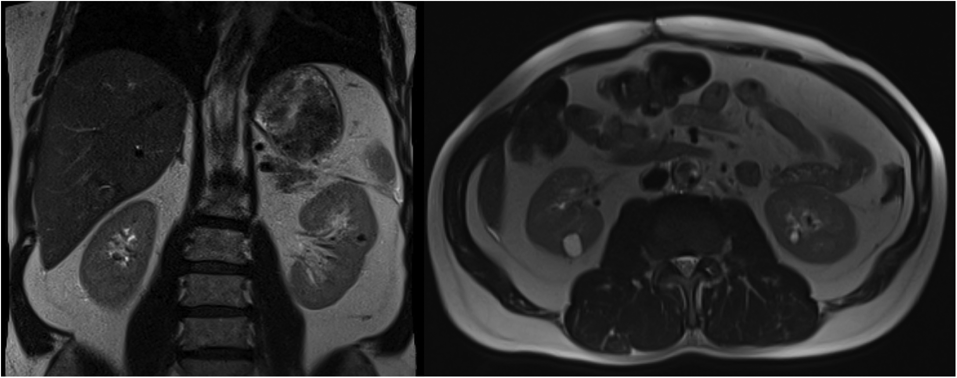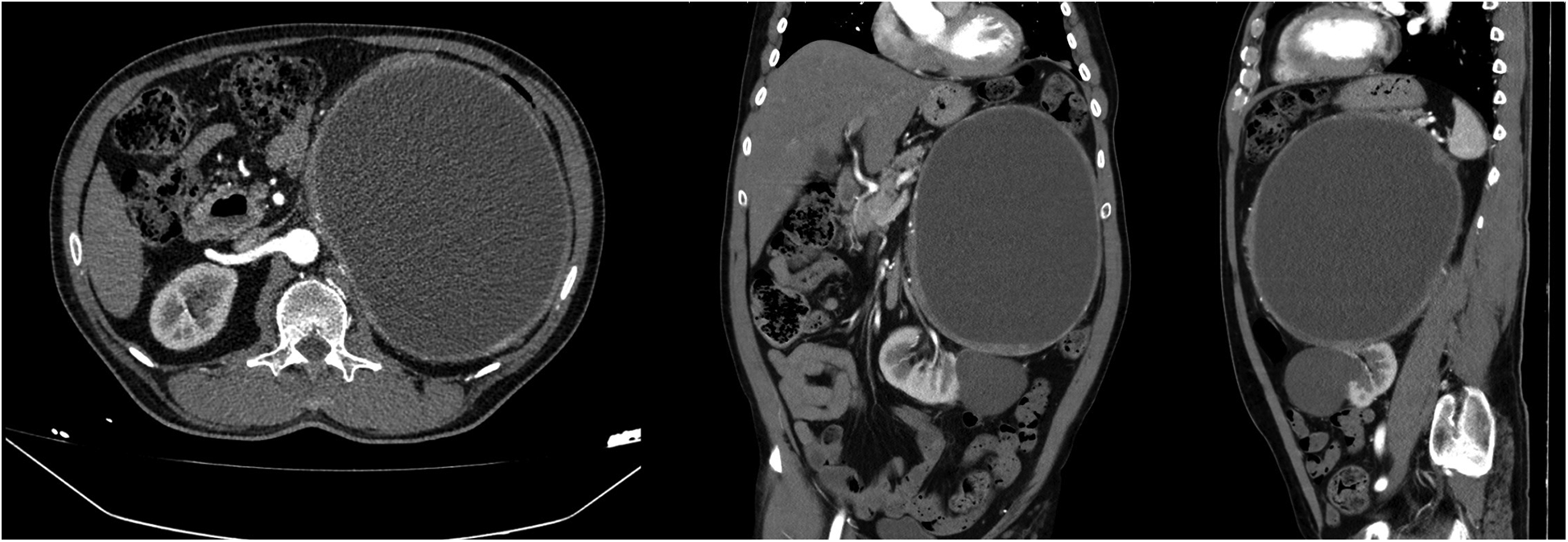 Computed tomography images of a giant left adrenal cystic mass and a left renal large parapelvic cyst.