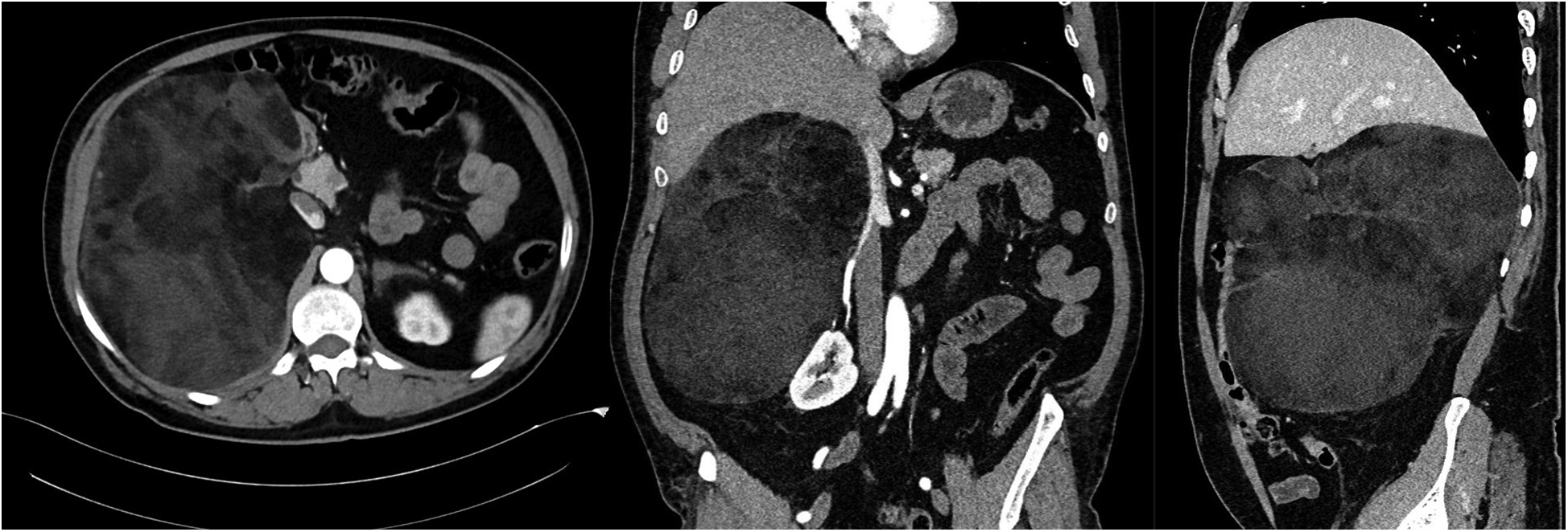 Computed tomography images of a giant right adrenal fatty mass.