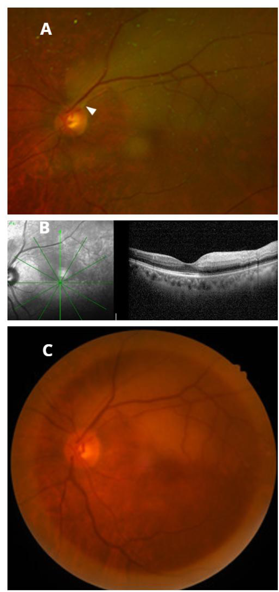 (A) Optos ultra-widefield imaging system: the white pointed tip indicates the location of the gray-white thrombus in the left temporal branch of the retinal artery. (B) Optical coherence tomography shows edema, thickening, and enhanced reflex in the inner layer of the temporal retina of the left eye. (C) Photograph of the posterior pole of the fundus: the retinal artery of the superior temporal branch became thinner with gray edema of the superior temporal retina.