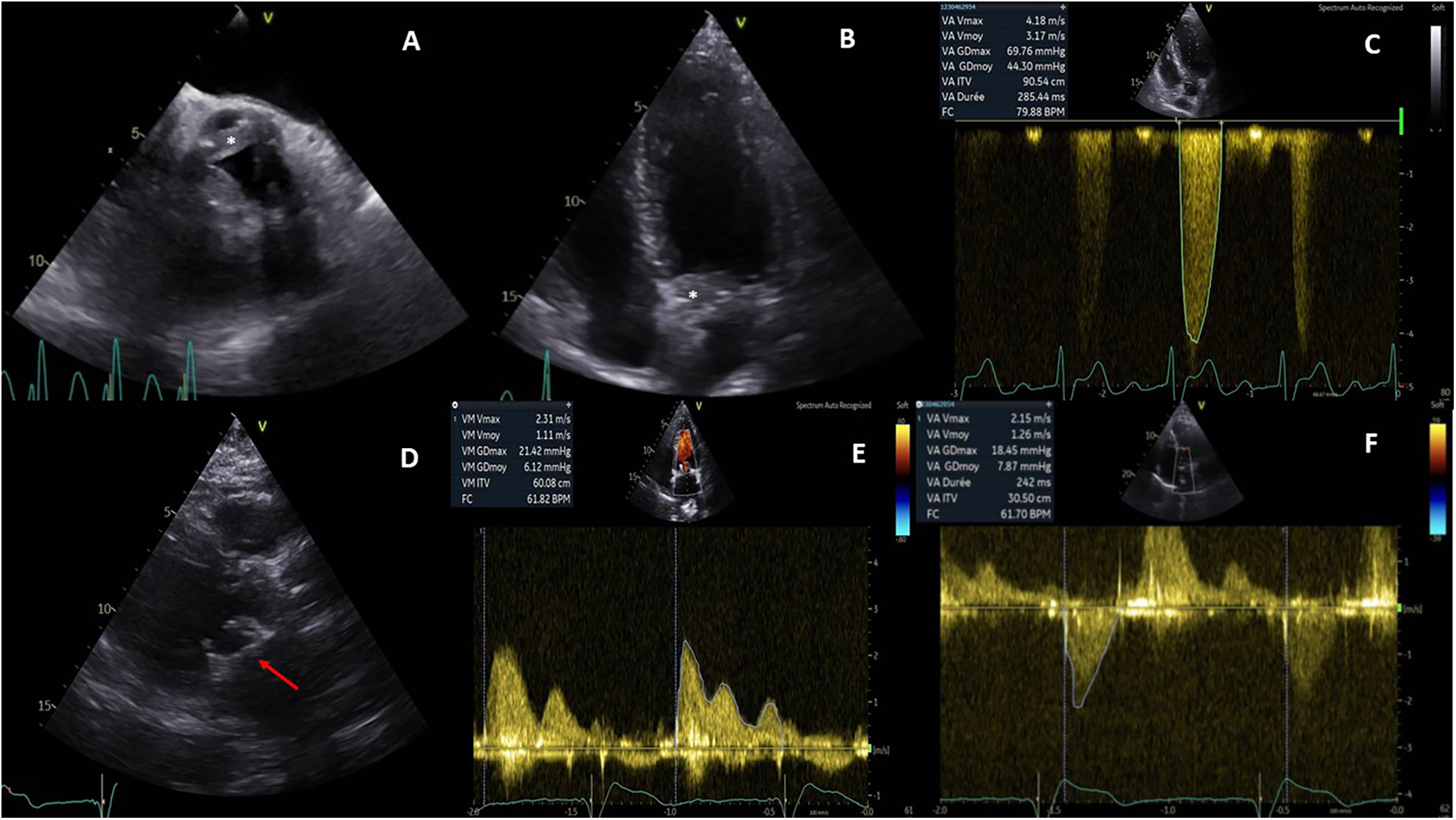 Pre- and postoperative echocardiography. Preoperative echocardiography showed an abnormal thickening of aortic cusps (*, A) extending to the anterior leaflet of the mitral valve (*, B) and resulting a significant subaortic obstruction (maximal gradient of 70 mmHg, C). Postoperative echocardiography demonstrated a well-positioned mitral bioprosthesis (arrow, D); the mean transprosthetic gradient was 1.1 mmHg (E) in the mitral position and 7.8 mmHg (F) in the aortic position.