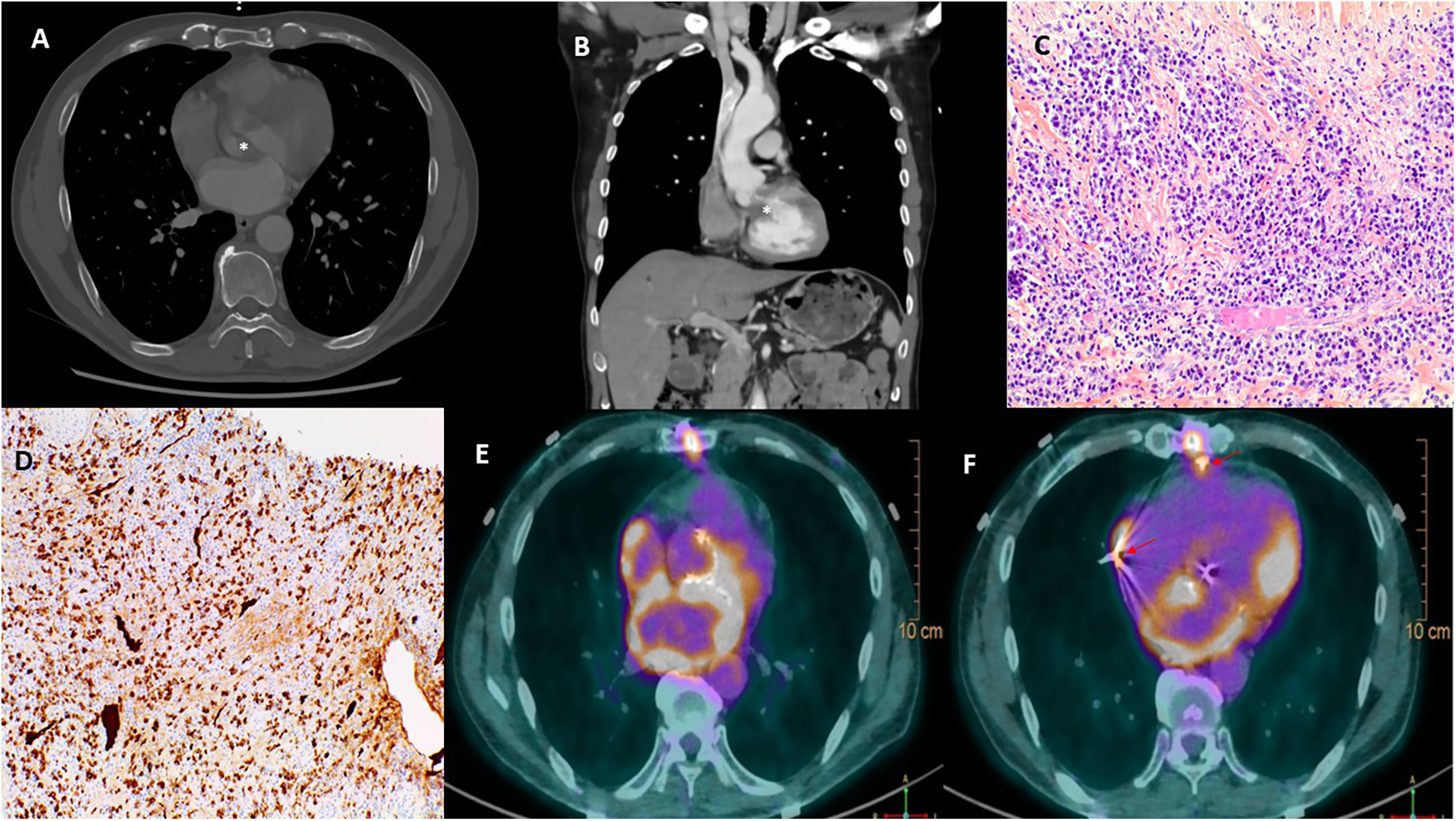 Multimodal images depicting IgG4-RD. Computerized tomography confirmed a significant thickening of the aortic valve (*, A) and an obstruction of the left ventricular outflow tract (*, B). Hematoxylin and eosin stain (C) of resected tissue demonstrated storiform fibrosis and dense inflammatory infiltrate with a majority of lymphocytes and plasma cells. Immunoglobulin G4 immunohistochemical stain (D) showed numerous IgG4+ plasma cells. 18F-Fluorodeoxyglucose positron emission tomography (E,F) demonstrated a hypermetabolism due to a recent surgery in the left atrium, the aortic root, and the sites of epicardial electrodes (arrow, F).