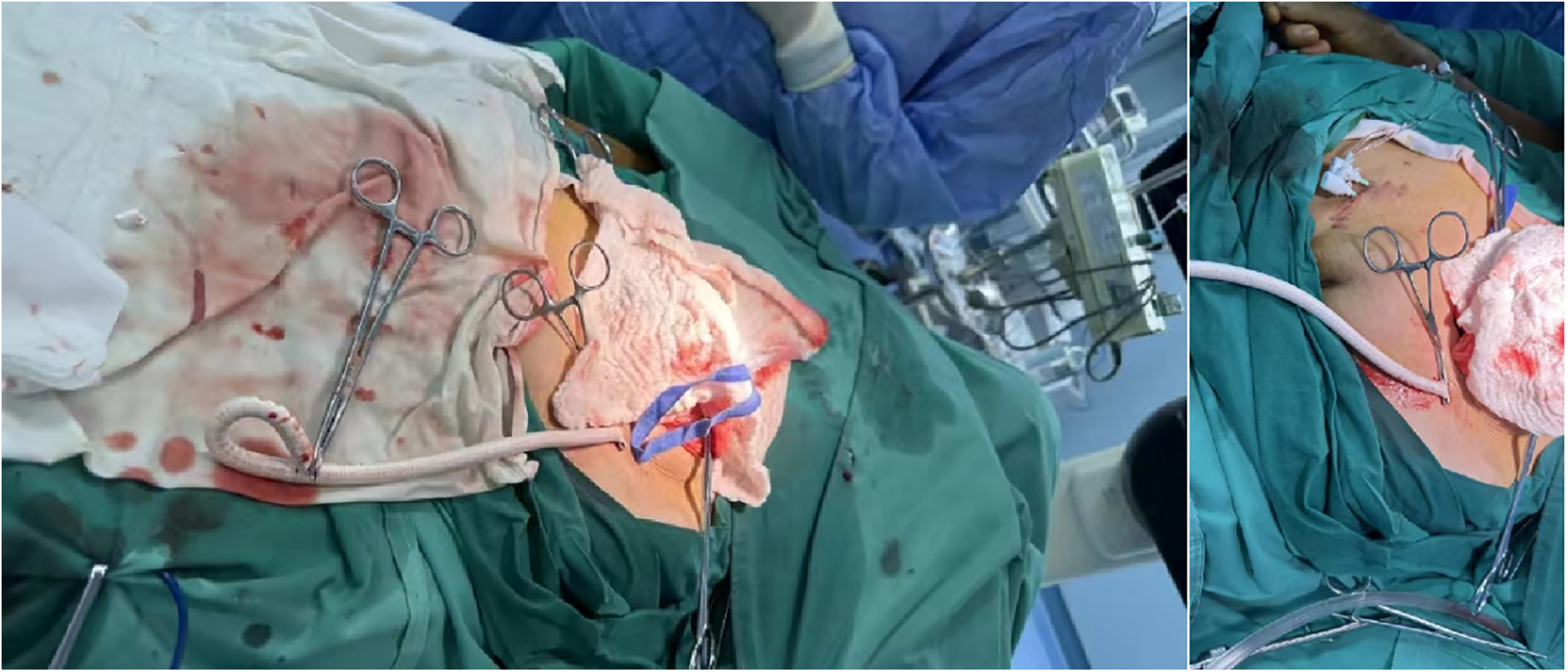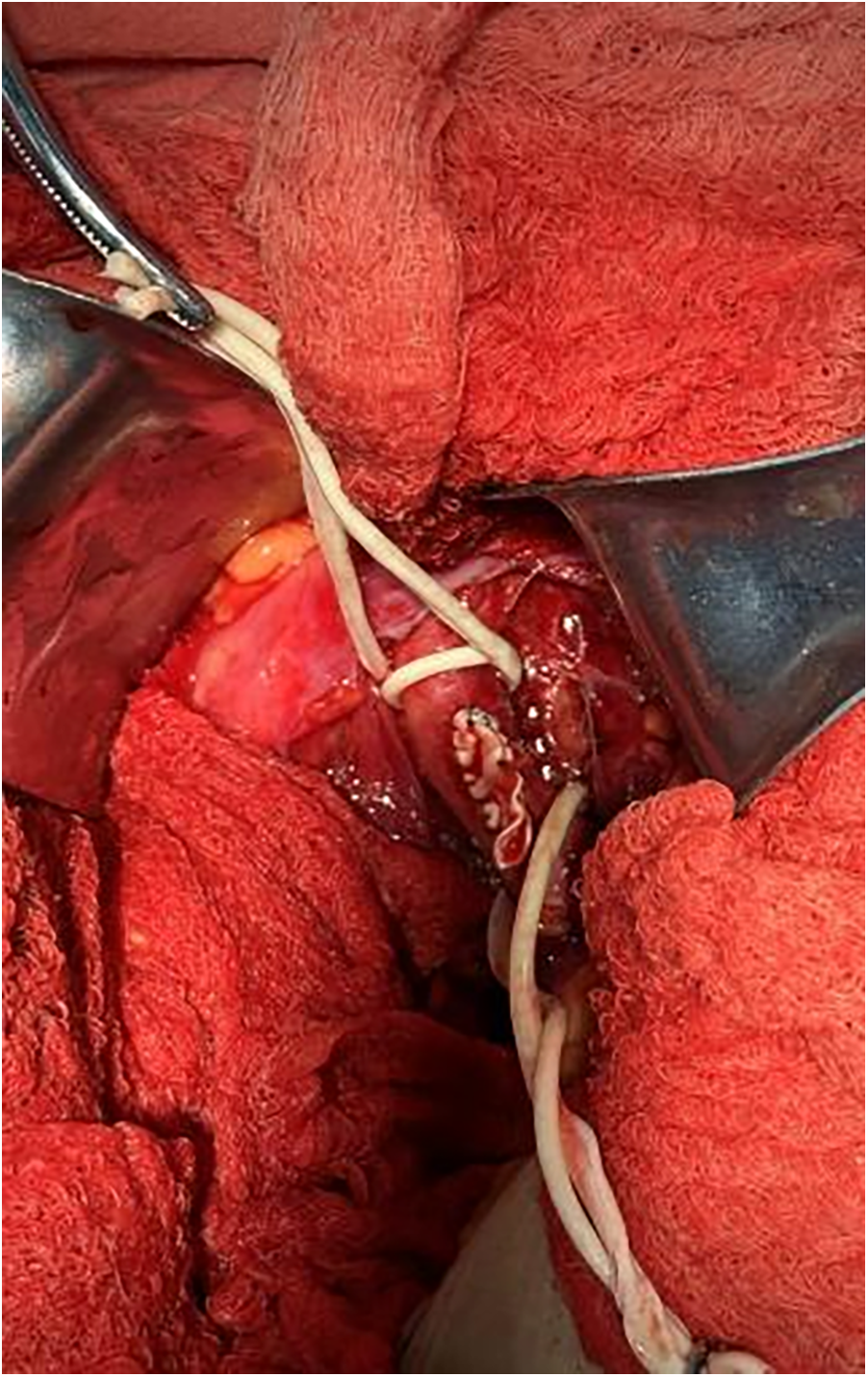 Depicts the suturing of artificial blood vessels with the incision subsequently closed.
