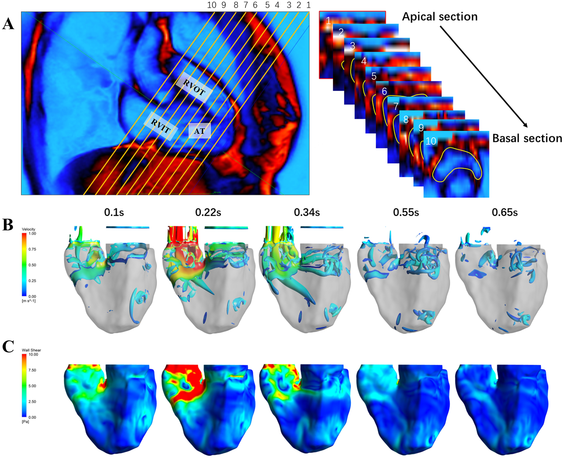 Visualization of RV flow dynamics and TSS during the cardiac cycle. (A) The left inset displays a coronal view of the RV include RVIT, AT and RVOT. The right inset illustrates a sequence of transverse section slices from apical to basal region, with yellow lines outlining the endocardium. (B) Time-resolved velocity field within the RV at different time points during the cardiac cycle. (C) Turbulent shear stress distribution on the RV walls at corresponding time points.