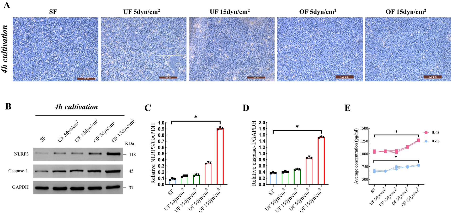 Of activate NLRP3 inflammasome in cardiomyocytes (n = 3 per group). (A) Representative images of hiCMs after 4 h of cultivation under different shear stress conditions (scale bar: 500 μm). These images illustrate the morphological changes in response to varying shear stress levels. (B) Western blot analysis showing the expression levels of NLRP3 and Caspase-1 after 4 h of cultivation under the same shear stress conditions as in (A) (C,D) Quantification of NLRP3 and caspase-1 expression relative to GAPDH from the Western blot analysis in (B) (E) Average concentrations of IL-18 and IL-1β in the culture medium after 4 h of cultivation under different shear stress conditions. Data are represented as mean ± SEM. Statistical significances were determined by Kruskal–Wallis one-way ANOVA (C,D). *P < 0.05.