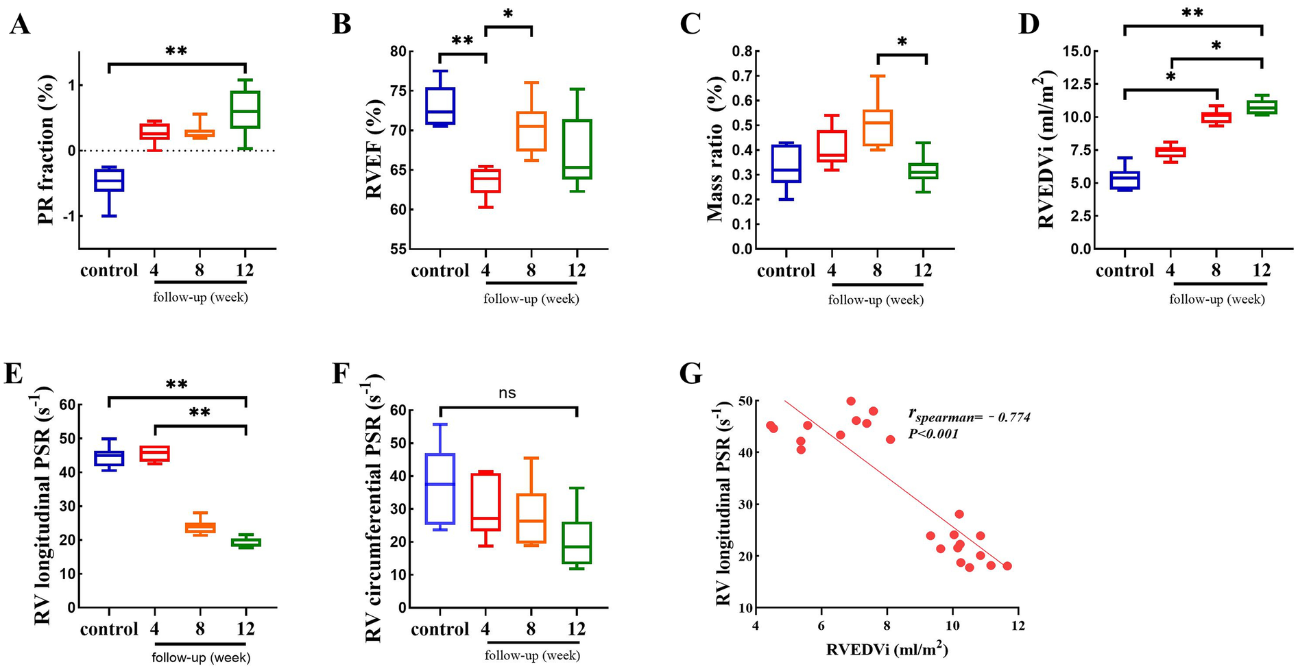 Comparison of RV functional and volumetric para meters between control and intervention groups. Data are represented as mean±SEM. Statistical significances were determined by single-factor repeated design A NOVA (A-F) and Spearman correlation (G). *P<0.05, **P< 0.01.