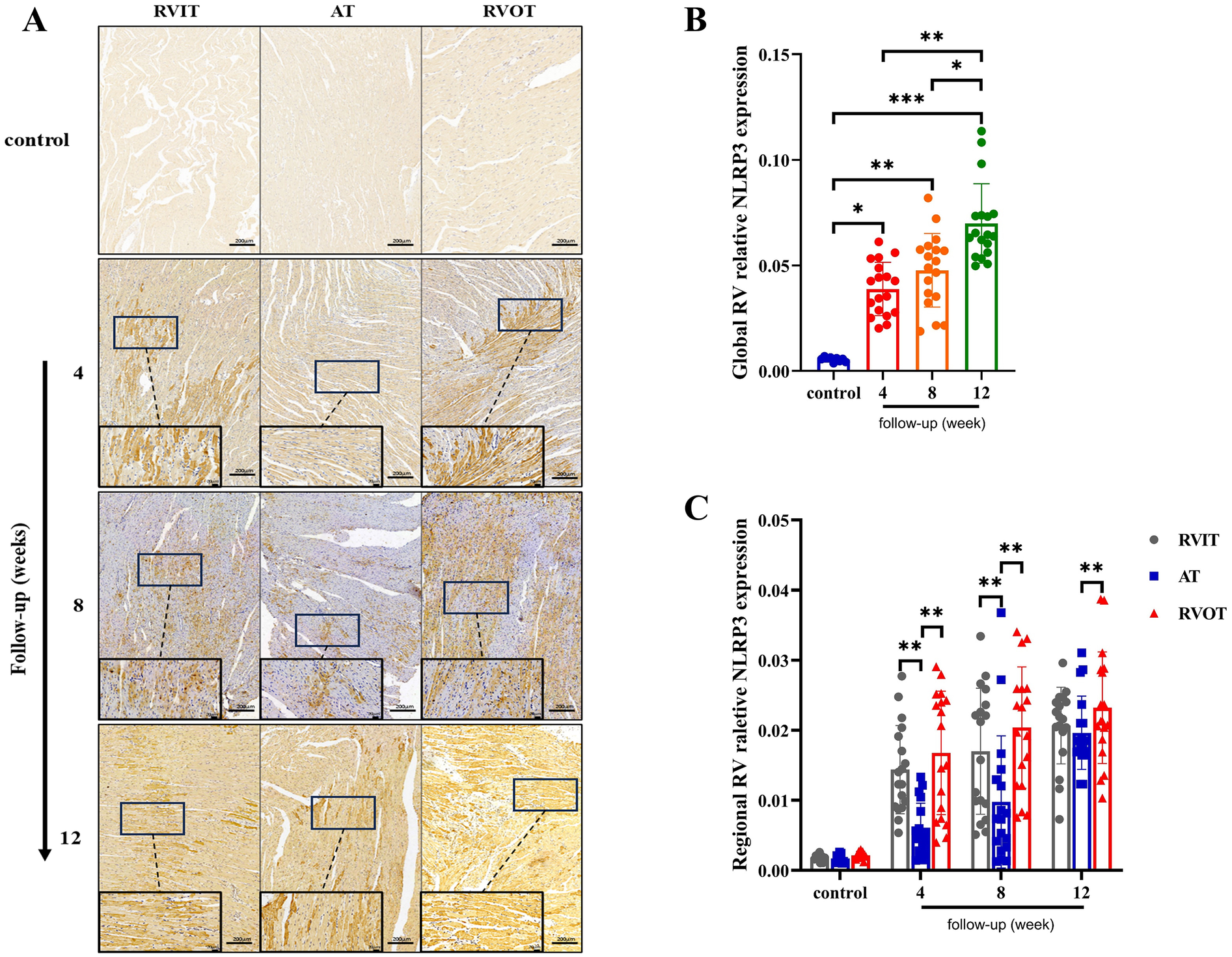 4 weeks post-surgery, NLRP3 expression was only detected in RVIT and RVOT. By the 8th week, NLRP3 expression had started to appear in AT and had continued to increase in both RVIT and RVOT. At the 12th week, the NLRP3 expression in AT was close to that of RVIT, although both were still lower than that in RVOT (Figure 5A). The global RV NLRP3 expression was higher at 4 weeks and 8 weeks post-surgery compared to the control group [4 weeks (0.04 ± 0.01) vs. control (0.005 ± 0.001), P = 0.04; 8 weeks (0.05 ± 0.02) vs. control (0.005 ± 0.001), P = 0.001], but the difference was not significant between the two time points (Figure 5B). The NLRP3 expression was significantly higher at 12 weeks post-surgery compared to the previous two time points [12 weeks (0.07 ± 0.02) vs. control (0.005 ± 0.001), P < 0.001; 12 weeks (0.07 ± 0.02) vs. 4 weeks (0.04 ± 0.01), P < 0.01; 12 weeks (0.07 ± 0.02) vs. 8 weeks (0.05 ± 0.02), P = 0.039] (Figure 5B). The regional RV NRLP3 expression was notably distinct from each other, with the NLRP3 expression in RVOT being always higher than that in RVIT and AT at each follow-up time point (Figure 5C).