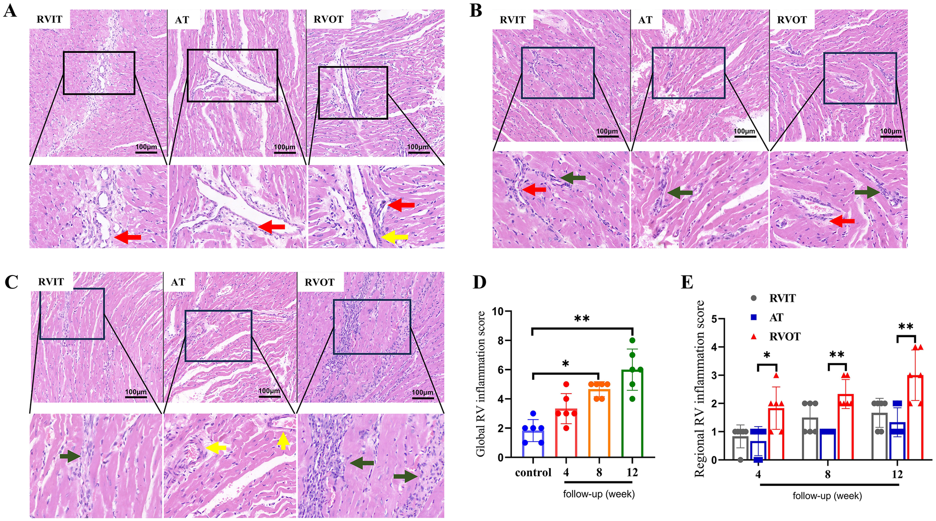 Analysis of myocardial inflammation of RV at different follow-up time points via H-E stain (n = 6 per group). (A) 4 weeks after PR surgery. (B) 8 weeks after PR surgery. (C) 12 weeks after PR surgery. Scale bar: A, B, C, 100 μm. (D) Comparison of inflammation scores of global RV. (E) Comparison of inflammation scores of regional RV in intervention groups. Data are represented as mean ± SEM. Statistical significances were determined by single-factor repeated design ANOVA (D) and Kruskal–Wallis one-way ANOVA (E) *P < 0.05, **P < 0.01. Red arrow: peri-microvascular inflammatory cells; Yellow arrow: wall thickening of microvessels; Green arrow: inflammatory cells in extracellular matrix.