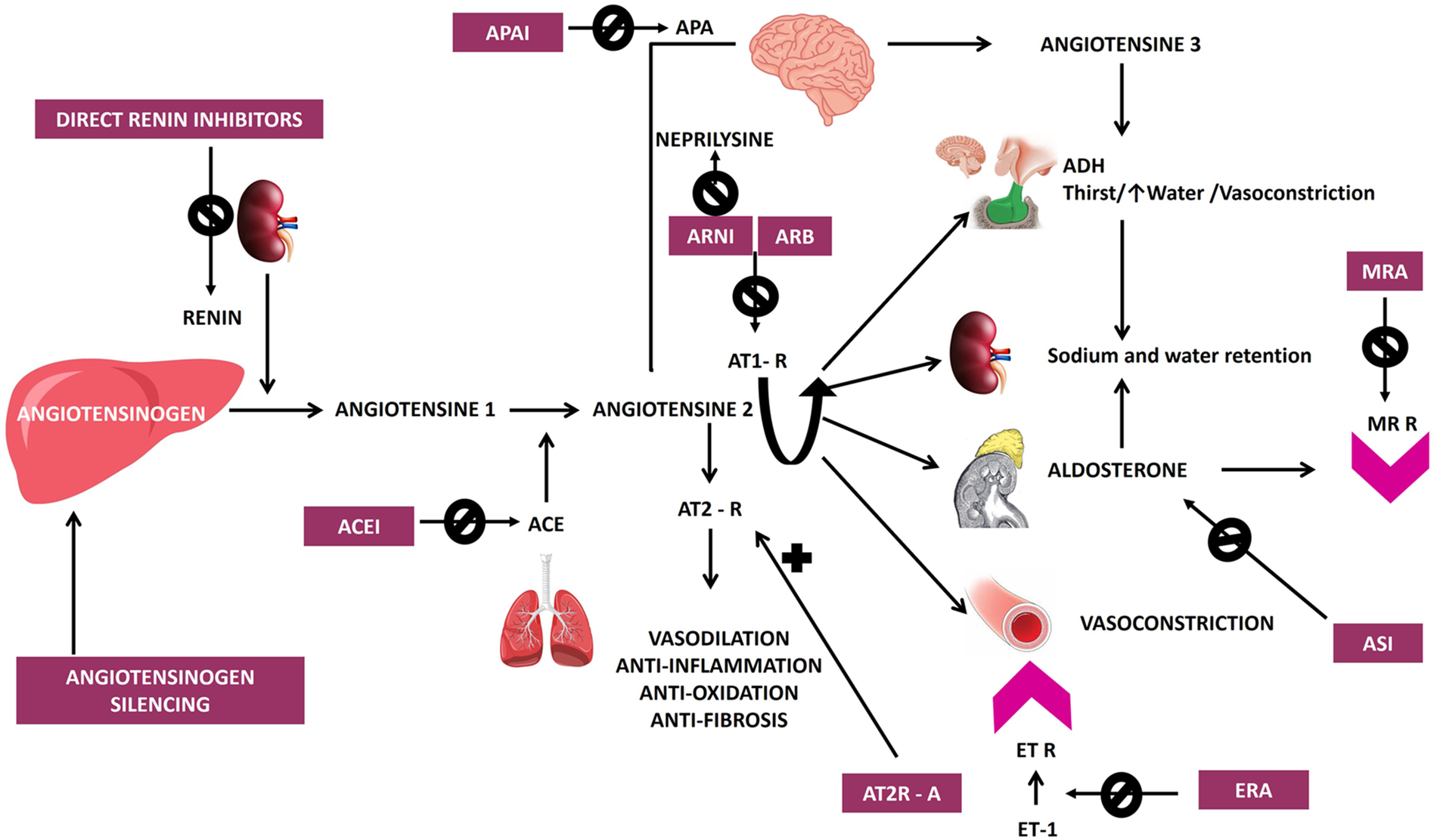 Schematic representation of the renin-angiotensin-aldosterone and endothelin systems along with their pharmacological targets, illustrating classical and novel therapeutic interventions in hypertension including direct renin inhibitors, angiotensin converting enzyme inhibitors (ACEI), angiotensin receptor blockers (ARB), angiotensin receptor neprilysin inhibitors (ARNI) mineralocorticoid receptor antagonists (MRA), and newer agents targeting various pathways, angiotensinogen silencing via siRNA (small interfering RNA), endothelin receptor antagonists (ERA), natriuretic peptide receptor 1 agonists (NPR1 agonists), aminopeptidase A inhibitors (APAIs), aldosterone synthase inhibitors (ASIs). AT1R, angiotensin II type 1 receptor; AT2R, angiotensin II type 2 receptor; ET R, endothelin receptor; ET, endothelin.