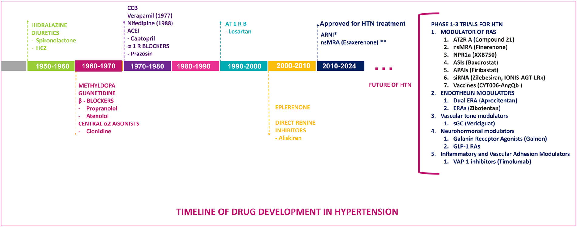 Timeline of antihypertensive drug development from 1950 to 2024, highlighting major therapeutic classes and emerging novel agents, both approved and in phases 1–3 of trials for the treatment of hypertension, including AT2R agonists, nsMRA, and various other novel therapeutic approaches. ACEI, angiotensin-converting enzyme inhibitors; APAIs, aminopeptidase A inhibitors; ASI, aldosterone synthase inhibitors; AT1R, angiotensin II type 1 receptor blockers; AT2R, angiotensin II type 2 receptor agonists; ARNI, angiotensin receptor neprilysin inhibitor; CCB, calcium channel blockers; ERA, endothelin receptor antagonist; GLP1 RAs, glucagon-like peptide 1 receptor agonists; HCZ, hydrochlorothiazide; HTN, hypertension; nsMRA, non-steroidal mineralocorticoid receptor blocker; NPR1 agonists, natriuretic peptide receptor 1 agonists; R, receptor; RAS, renin-angiotensin system; sGC, soluble guanylate cyclase, stimulator; siRNA, small interfering RNA; VAP-1, vascular adhesion protein 1.