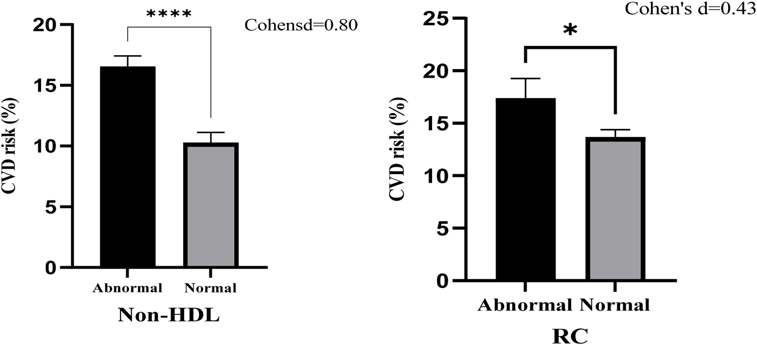 The 10-year ASCVD risk for each participant was assessed using the Framingham Risk Score (FRS), based on the algorithm developed by D'Agostino et al. (29). A 10-year ASCVD risk score ≥20% was classified as high cardiovascular risk. Although ASCVD risk calculators may underestimate risk in Black populations, they remain widely used and endorsed by clinical guidelines. Their use in this study allows for comparability with other published works and enables the assessment of how non-HDL-c and RC correlate with an established risk prediction model, despite its known limitations. Insulin resistance was assessed by the triglyceride glucose index derived by the formula TyG = ln[FBS(mg/dl) × TG (mg/dl)]/two developed by Simental-Mendía et al. (30). A TyG index >8.7 was considered indicative of insulin resistance, based on previously published studies validating this cut-off in populations with type 2 diabetes mellitus.