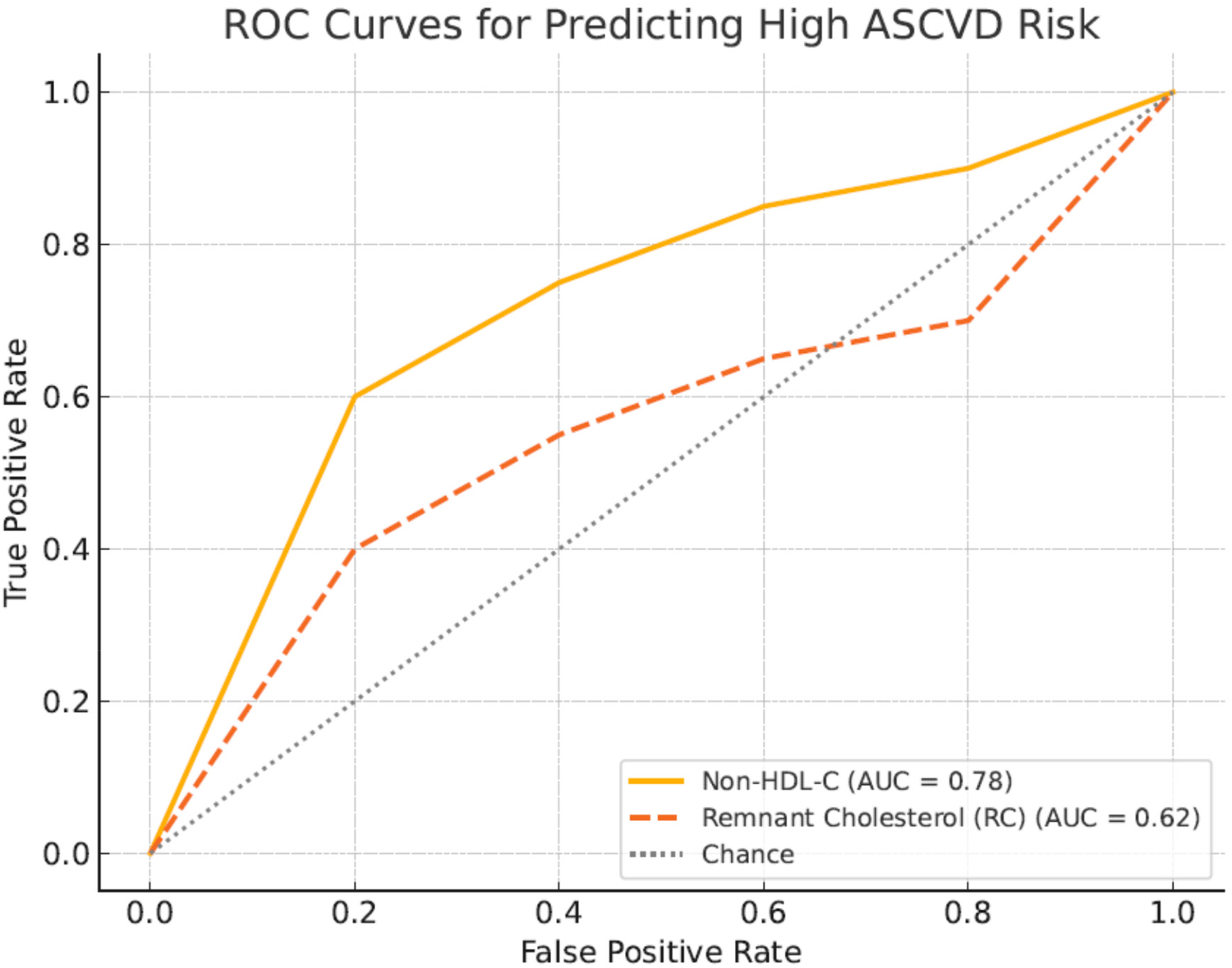 Non-HDL-C was significantly associated with higher ASCVD risk and elevated hs-CRP and resistin levels, while RC showed weaker, non-significant associations. Non-HDL-c had a higher AUC (0.78 vs. 0.62), sensitivity, and specificity. Nearly half of participants (49.4%) had elevated TyG index (>8.7). Non-HDL-C consistently outperformed RC across subgroups.