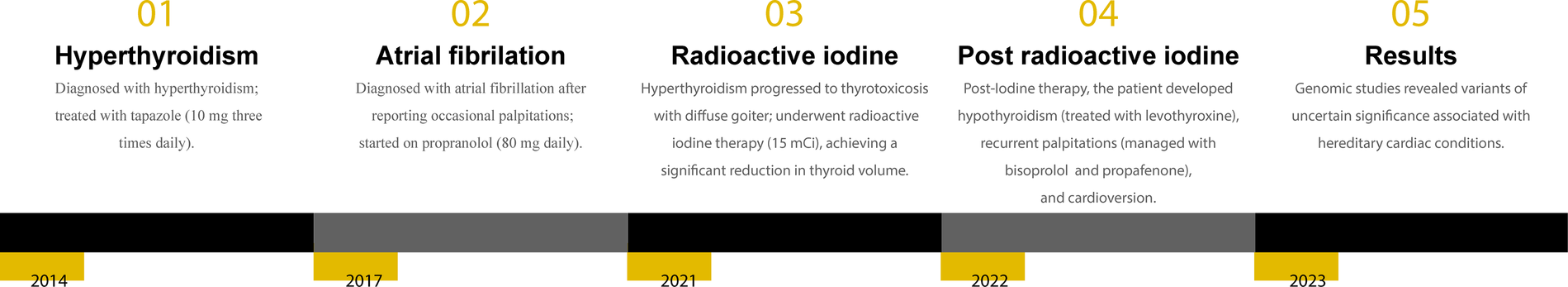 Timeline of clinical events. The figure illustrates the chronological progression of the patient's clinical history, including the diagnosis of hyperthyroidism in 2014, the onset of atrial fibrillation in 2017, radioiodine treatment in 2021, subsequent development of hypothyroidism, genetic testing, and successful electrical cardioversion in 2022 and 2023.