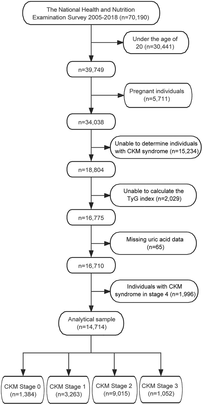 This cross-sectional study utilized data from the NHANES 2005–2018. NHANES employs a complex, multistage probability sampling design to collect nationally representative data through standardized questionnaires, physical examinations, and laboratory tests. From the NHANES 2005–2018 population, we excluded participants aged <20 years, pregnant women, individuals with undetermined CKM syndrome status due to incomplete data for key staging variables [missing measurements for body mass index (BMI), waist circumference, blood pressure, glucose parameters, lipid profiles, kidney function, or cardiovascular disease history], those with missing data for TyG index calculation (fasting triglycerides and glucose) or serum uric acid measurements, and participants with stage 4 CKM syndrome, as our study focused specifically on early-stage disease progression and intervention opportunities. The final analytic sample comprised adults with early-stage (0–3) CKM syndrome.