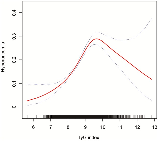 Figure 2. The association between TyG index and hyperuricemia in a population with early-stage (stages 0–3) CKM syndrome. Age, sex, race/ethnicity, PIR, educational level, METs/week, smoking, drinking, BMI, eGFR, glucose metabolism state, hypertension, hyperlipidemia, and HEI-2015 were adjusted. TyG, triglyceride-glucose; CKM, cardiovascular-kidney-metabolic; PIR, poverty income ratio; MET, metabolic equivalent; BMI, body mass index; eGFR, estimated glomerular filtration rate; HEI, healthy eating index.